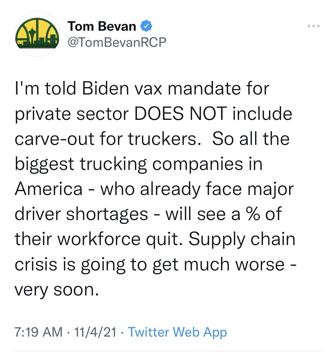 This is a rather terrible place to put a mandate, since truck drivers mostly spend their time alone driving trucks and we can’t afford to lose them at the moment. That doesn’t automatically mean this calls for a carve-out, since rules need to be simple and once the exceptions start things escalate quickly. It does introduce a potential serious issue, since trucking is a potential bottleneck on much of the economy.