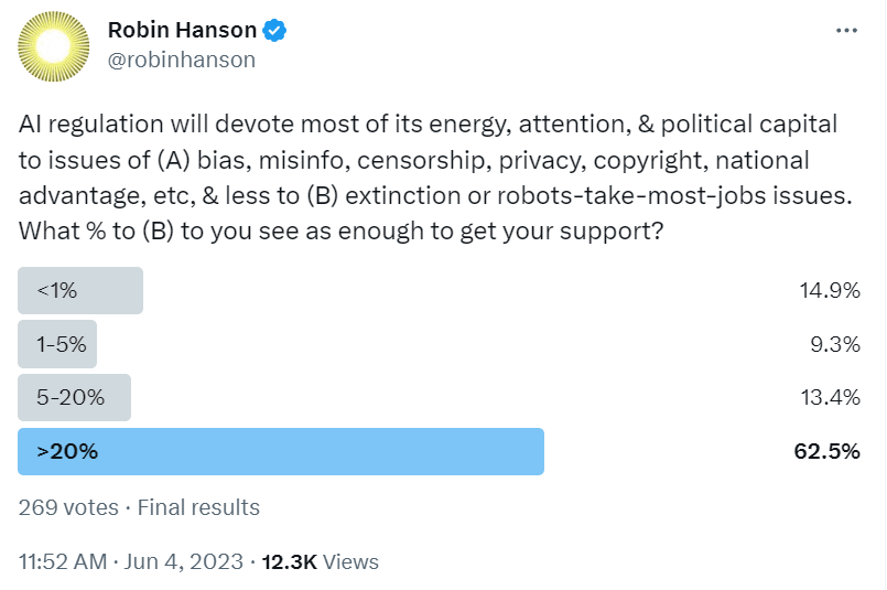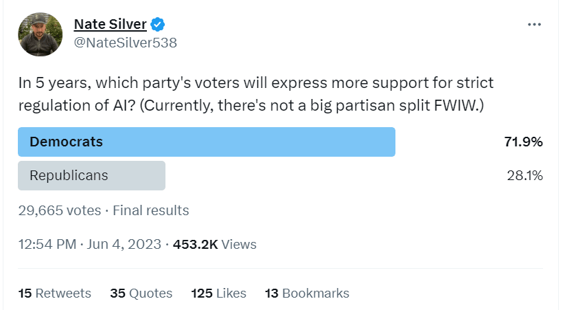 With regards to the partisan split, I think that an eventual partisan breakdown is inevitable, because in the current environment everything eventually becomes partisan. More importantly, the "prevent AI doom" crowd will find common cause with the "prevent the AI from being racist" crowd: even though their priorities are different, there is a broad spectrum of common regulations they can agree on. And conversely, "unchain the AI from wokeness" will wind up allying with "unchain AI entirely".
