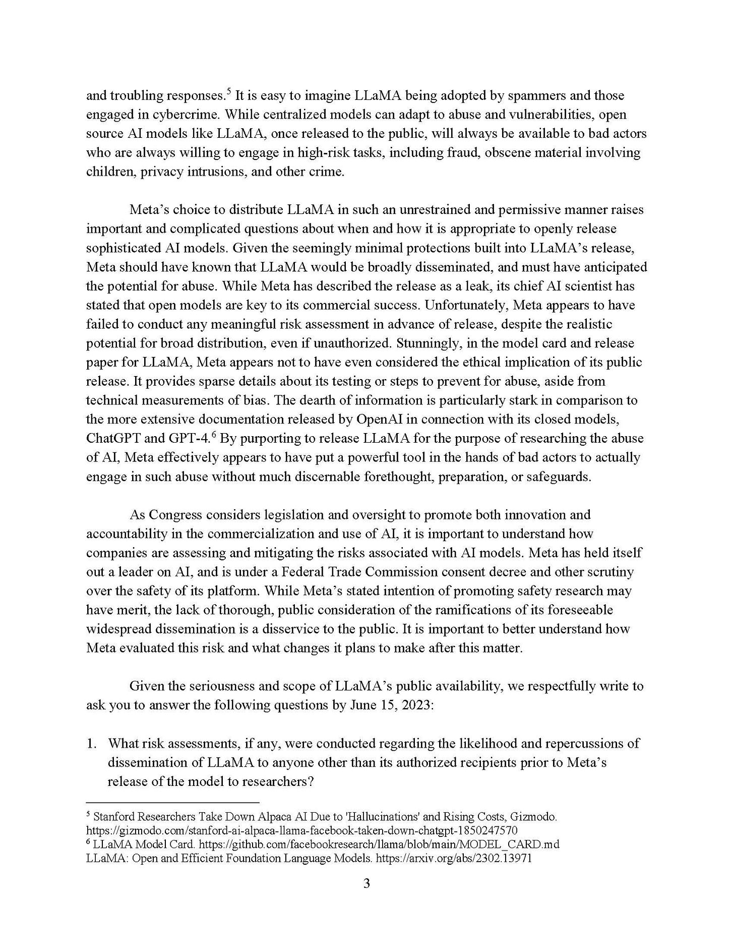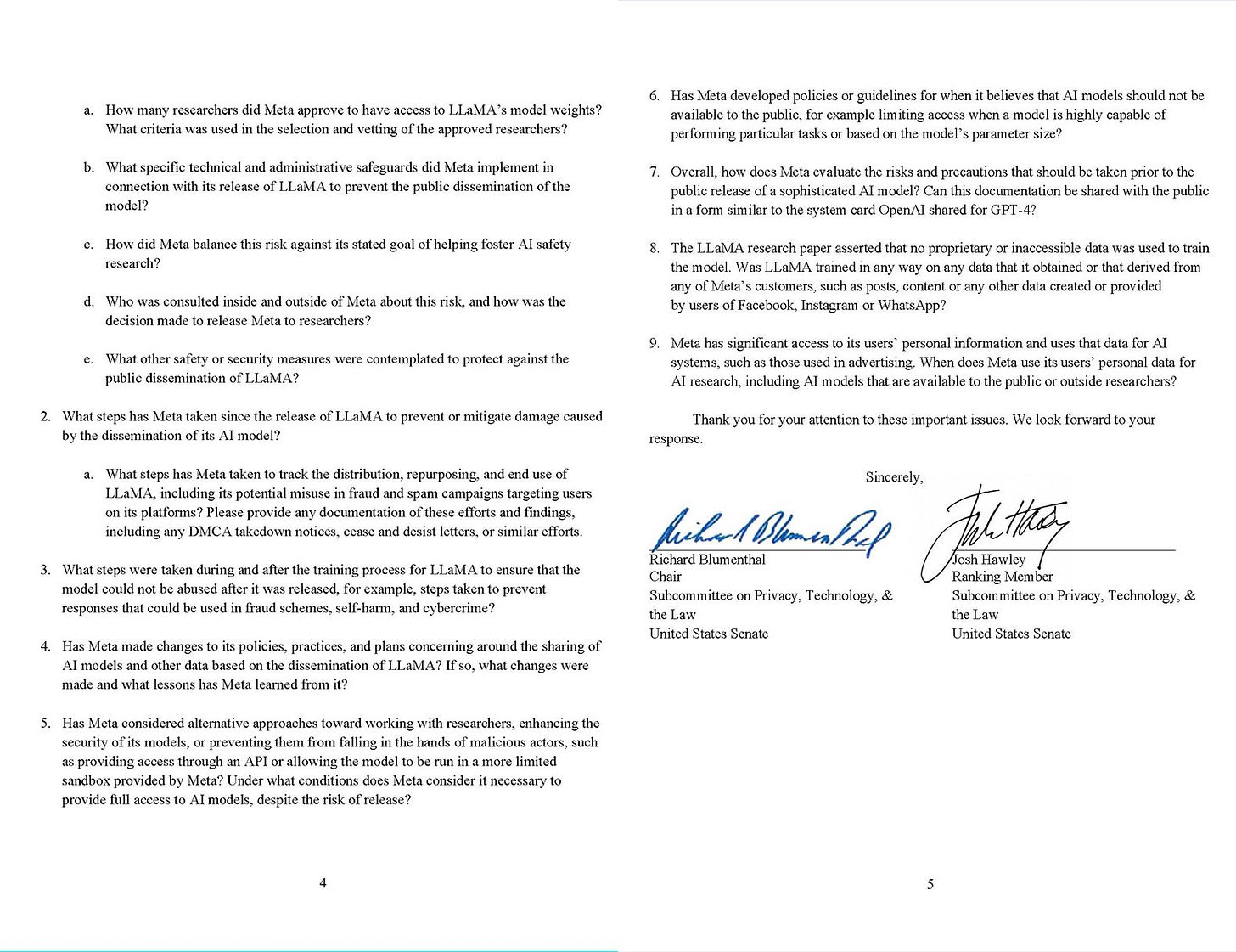 Senator Richard Blumenthal asks Meta what the hell they were thinking (aka “Llama?”) intentionally open sourcing Llama, and also to stop pretending they didn’t intentionally release Llama, among other things.