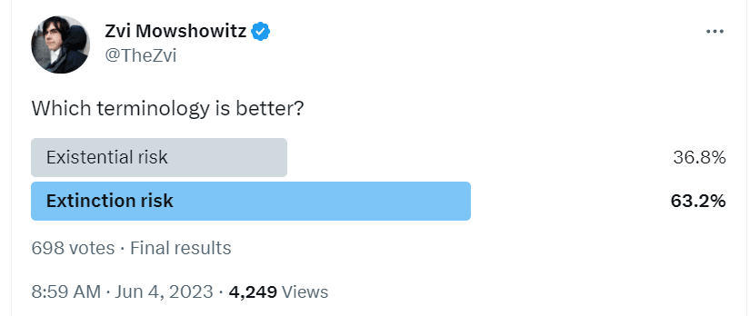 Discussion confirmed my intuition that extinction risk is better communication for most people and gives a more accurate impression and vibe, much easier for people to understand, although perhaps slightly less accurate.