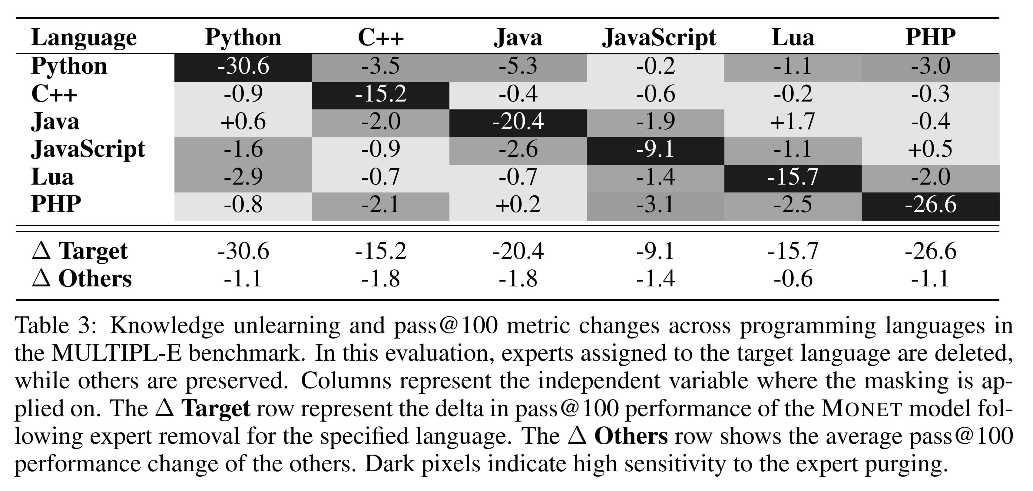 Similarly impressive results were found for unlearning one programming language and still being capable in others, as well as eliminating toxic speech (next two tables).