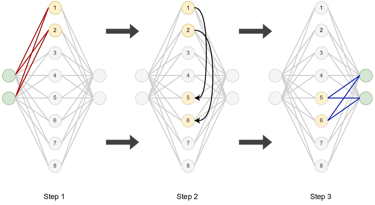 Now imagine that we want to activate expert 1,3. That is, we want bottom layer 1 and top layer 3. That is equivalent to the following using the MLP above. Step 1: activate only the connections that go from the input through the first section of the hidden layer (neurons 1 and 2 in the figure, corresponding to bottom layer 1), Step 2: move those activations to the third section of the hidden layer (neurons 5 and 6 in the figure, corresponding to top layer 3) and then Step 3: activate only the connections from the third section of the hidden layer to the output.