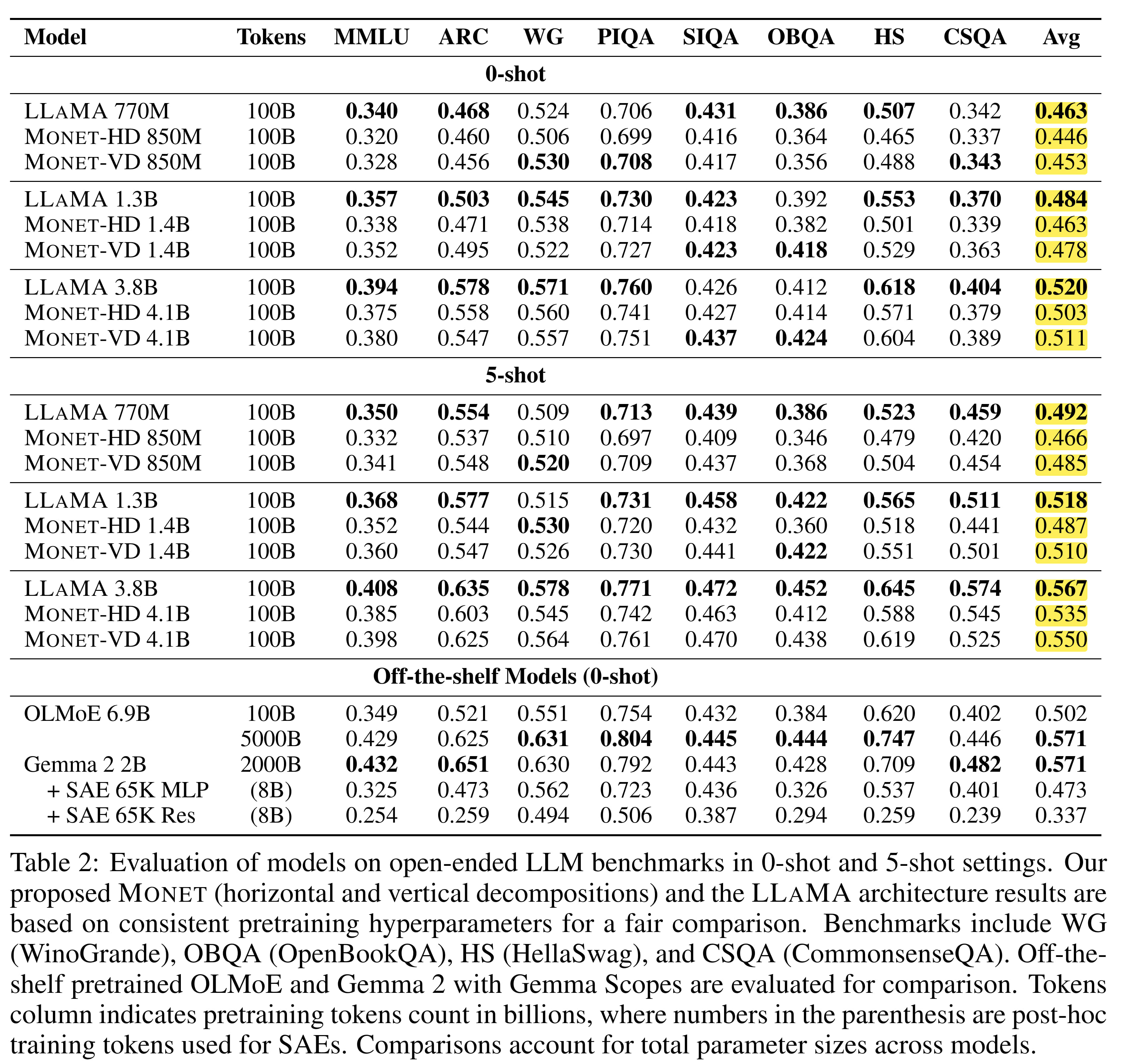 The paper compares MONET to equivalently sized and trained LLaMA models,[4] as well as OLMoE and Gemma models on various benchmarks. They find that MONET performs roughly on par with models of equivalent size. Additionally, MONET-VD consistently outperforms MONET-HD. The results are displayed in the following table. I've highlighted the 0-shot and 5-shot benchmark averages for LLaMA, MONET-HD and MONET-VD for easy comparison.