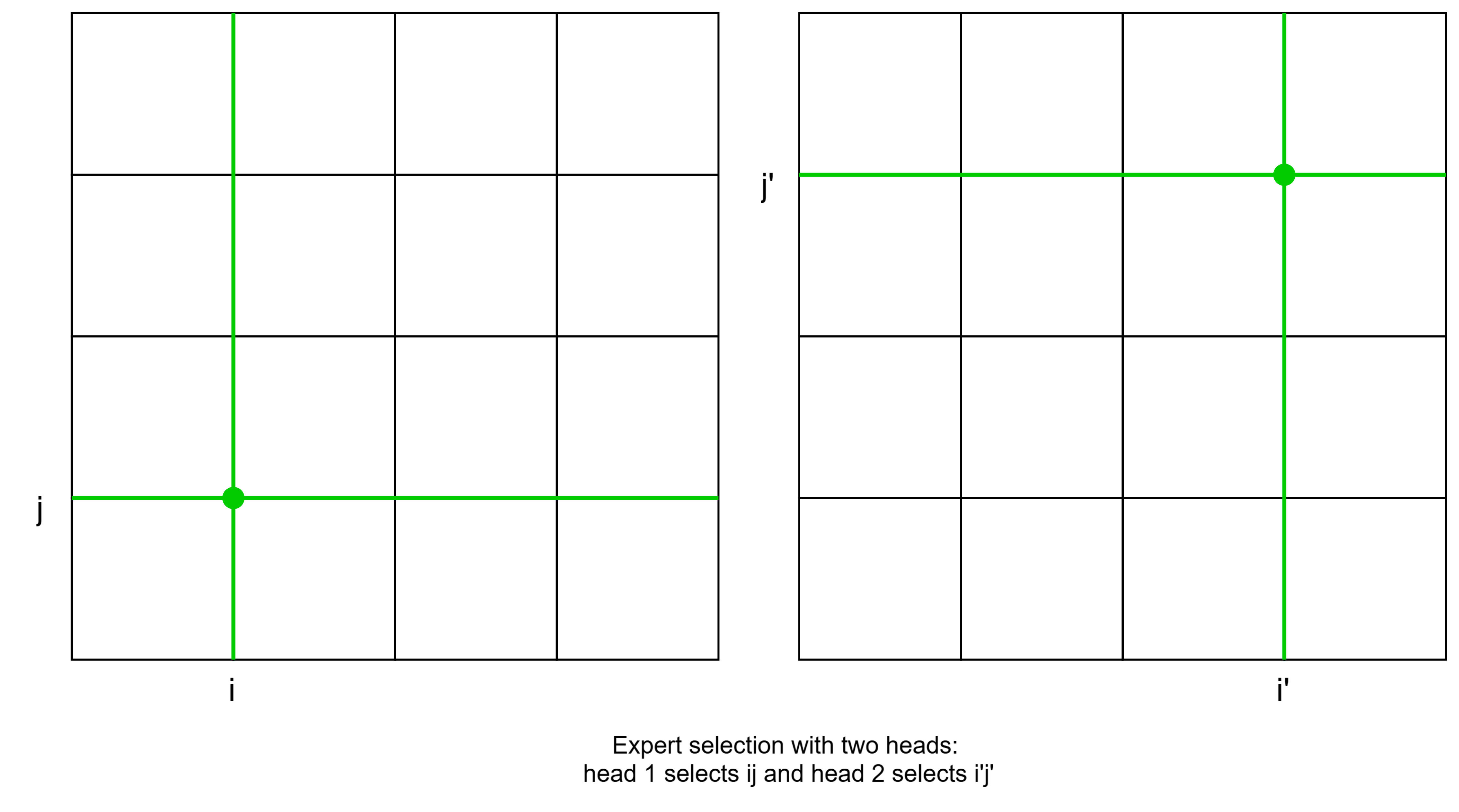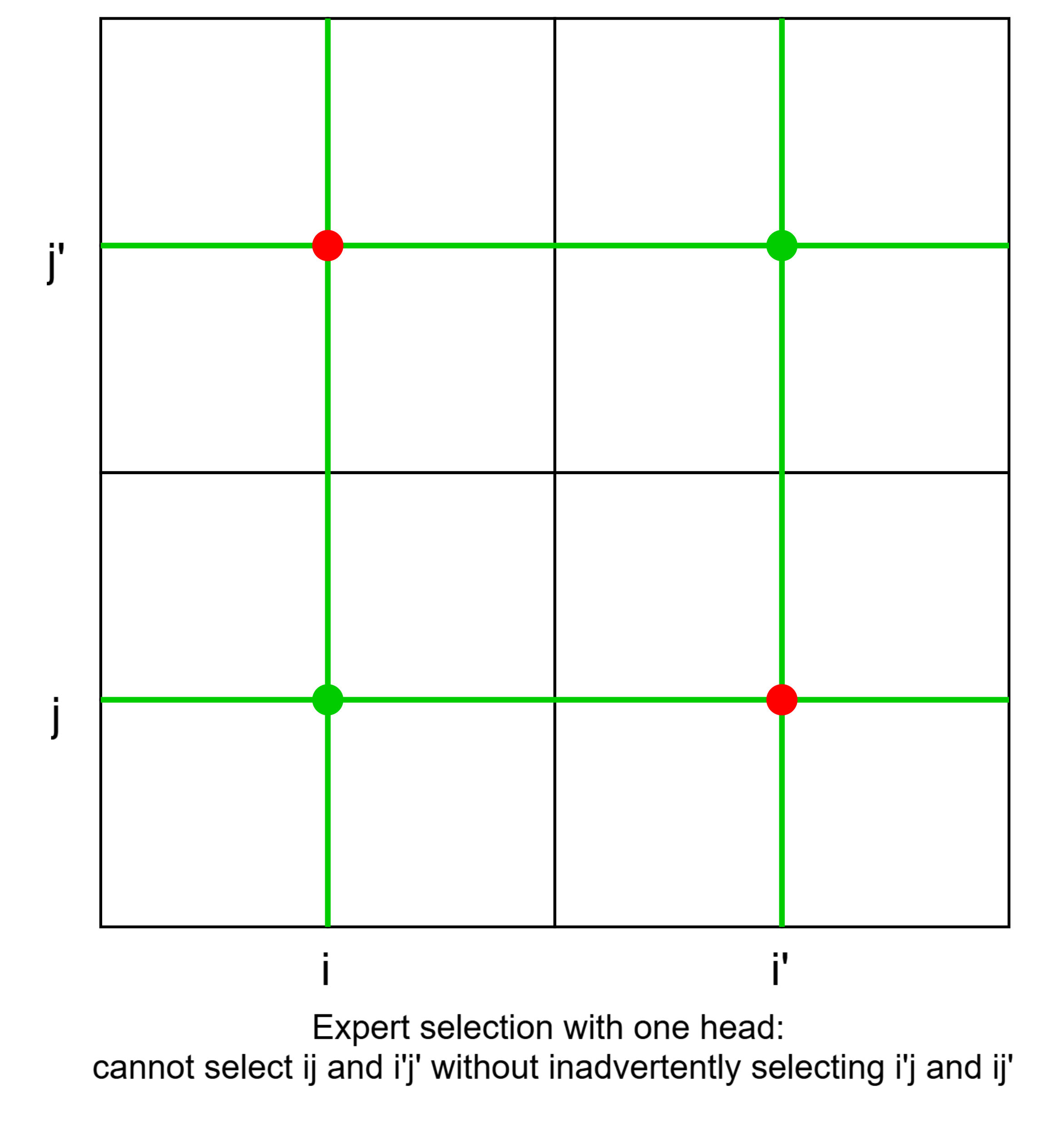 One limitation of product key composition is that it makes it difficult to select the top- experts for . For example, imagine we were utilizing HD with and the model wished to select experts and . The bottom layer router would select and and the top layer router would select and . However, by doing this, we have inadvertently selected and as well. Stated differently, by selecting the bottom layer and top layer independently, it's impossible to select arbitrary pairs of experts - we must select all combinations of our chosen bottom and top layer components.
