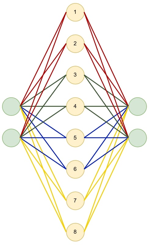 We can therefore equivalently interpret the MONET-HD architecture as a standard transformer MLP with a forced sparse activation and funky reshuffling of the hidden layer. Let me explain. Given a MONET-HD model with four bottom layers and four top layers, we can match bottom layer 1 with top layer 1, bottom layer 2 with top layer 2, etc, and then concatenate them to get the following MLP, where the red connections are from the combined bottom/top layer 1, the green connections are from the combined bottom/top layer 2, etc.