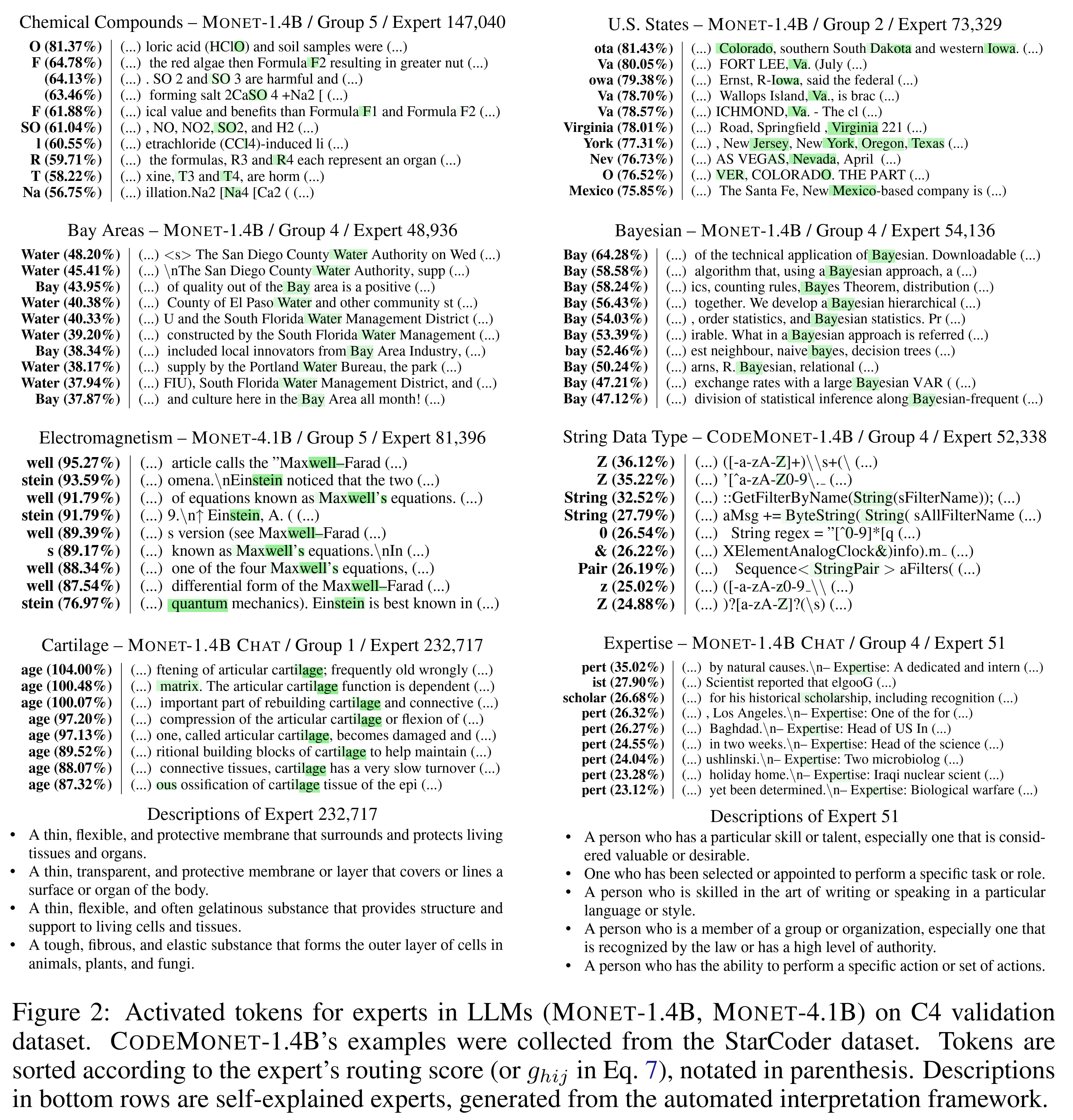 The authors find highly monosemantic experts, for example, an expert that activates on tokens relating to US states, and an expert that activates on tokens related to Bayesianism. I find the following figure quite impressive.