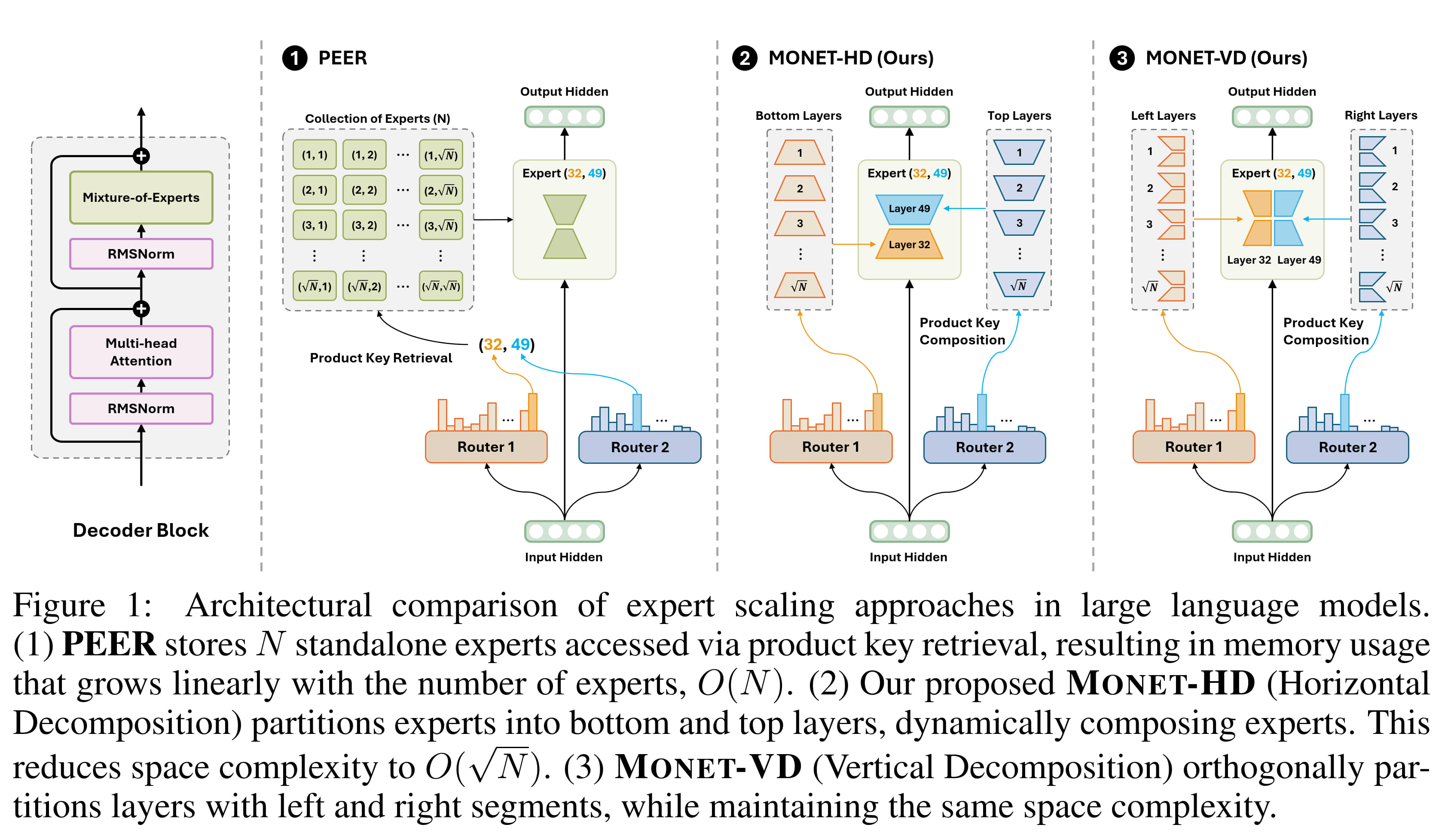 MONET enables efficient computation of a large number of experts by utilizing a novel product key composition routing system as visualized in Figure 1 of the paper, copied below.