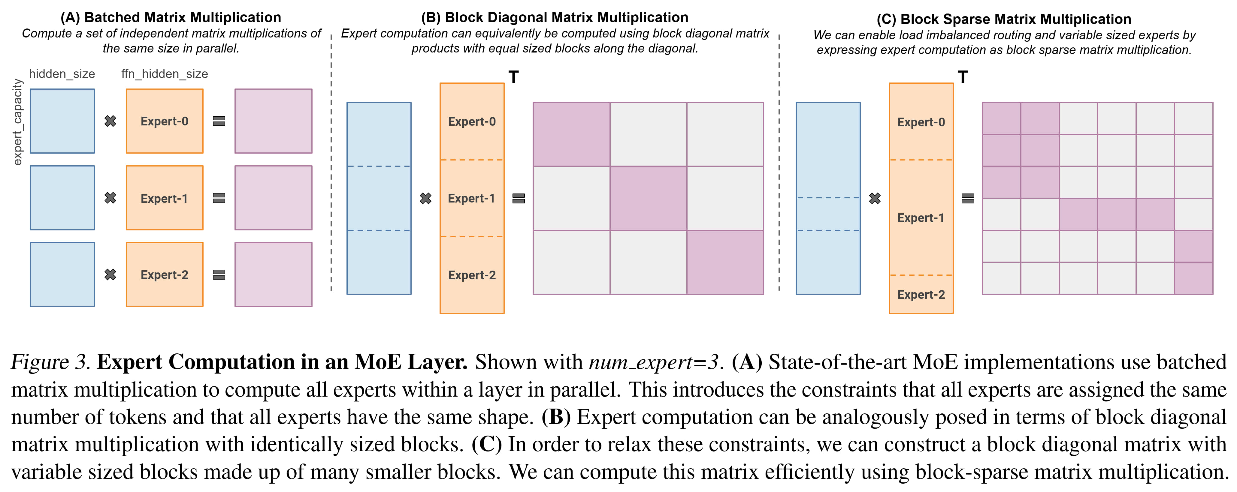 I propose solving this issue while respecting the load imbalance challenge by utilizing MegaBlocks. MegaBlocks convert the batched matrix multiplication of standard MoE algorithms to a block-sparse matrix multiplication. This technique allows for load imbalance between experts.