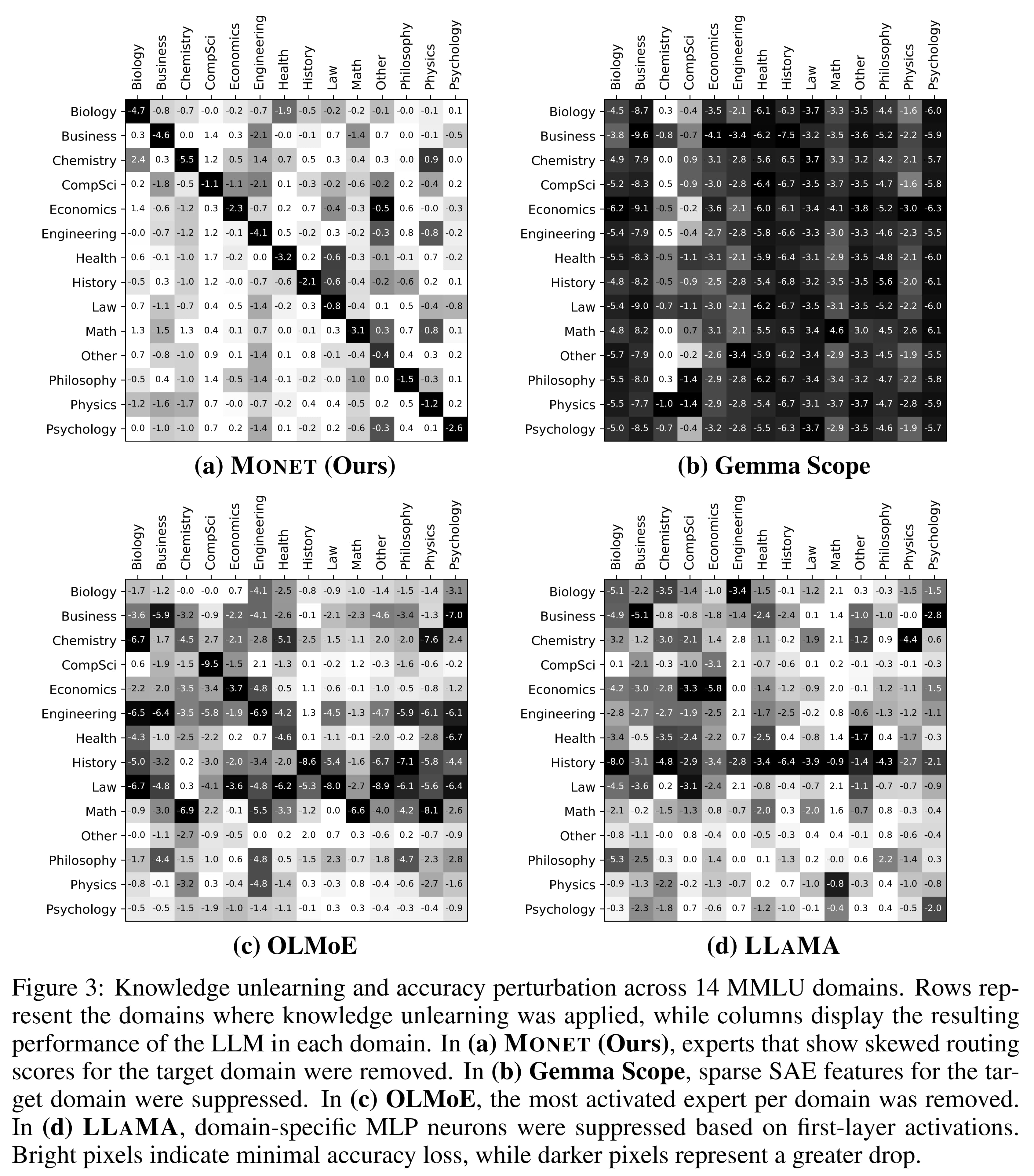 TL;DR: MONET is a novel neural network architecture that achieves interpretability by design rather than through post-hoc analysis. Using a specialized Mixture of Experts (MoE) architecture with ~250k experts per layer, MONET encourages individual components to learn specific, interpretable tasks (e.g., Python coding, biology knowledge, or toxicity generation). This enables selective removal of capabilities without harming performance in other domains.