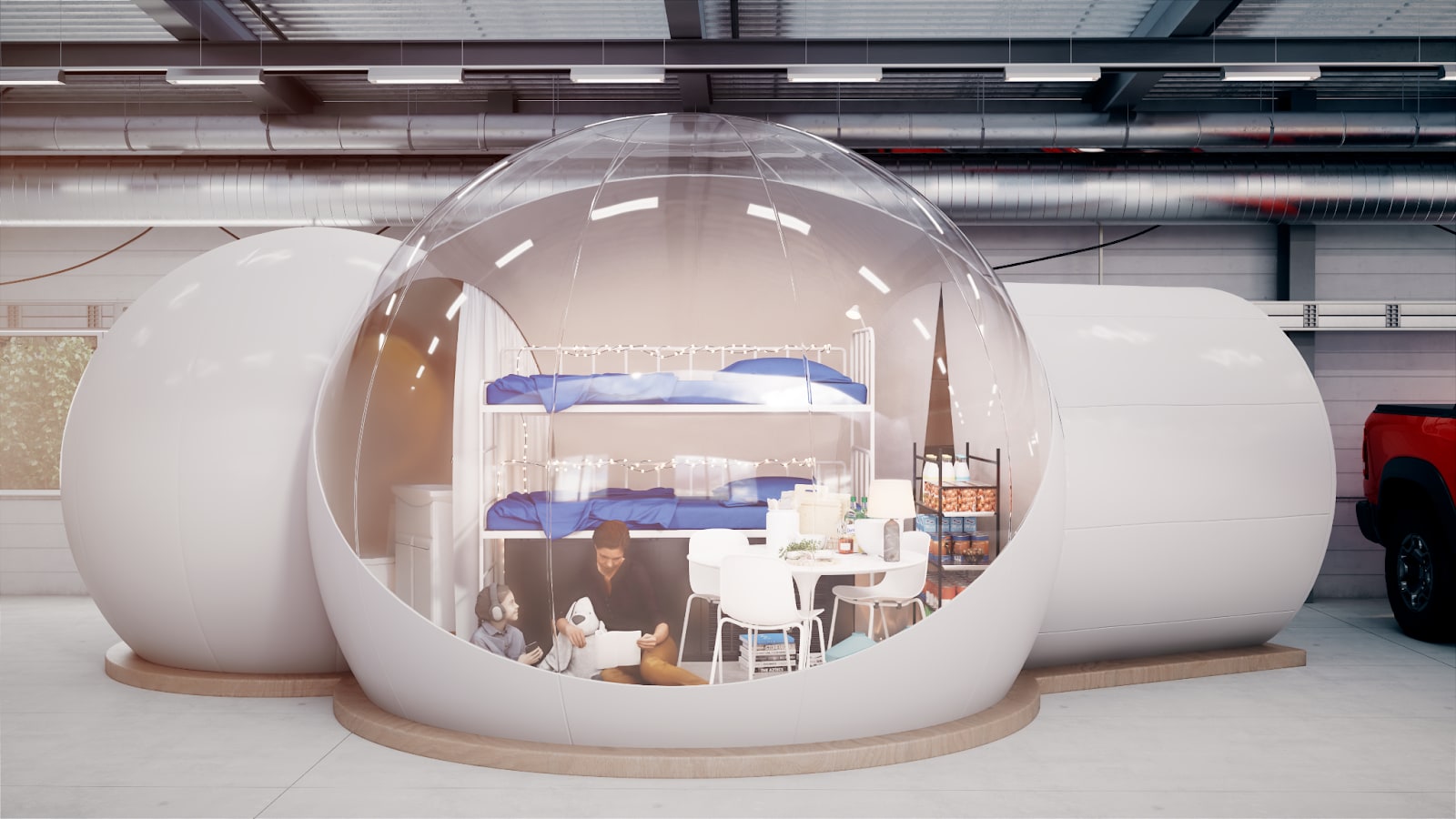 pictured: A fully equipped shelter along with two inhabitants deployed as intended inside a larger structure (in order to protect from particle intrusion by wind gusts)