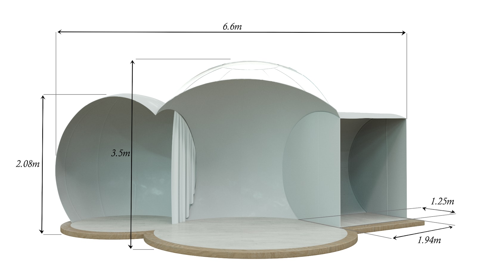 pictured: a cut-through view of an inflatable shelter with a small room, large room, and airlock
