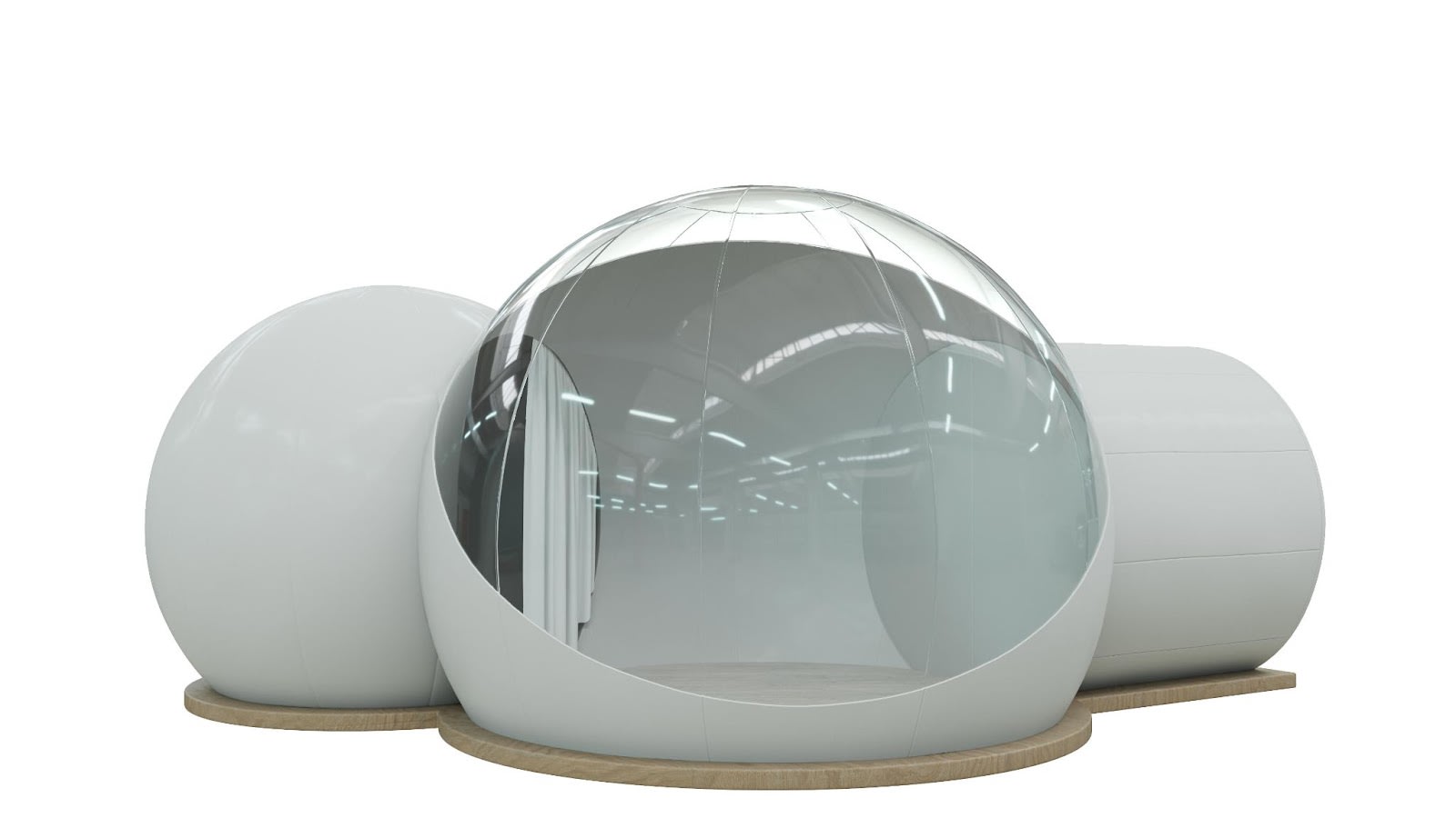 pictured: a view of a complete but empty inflatable shelter with a small room, large room, and airlock