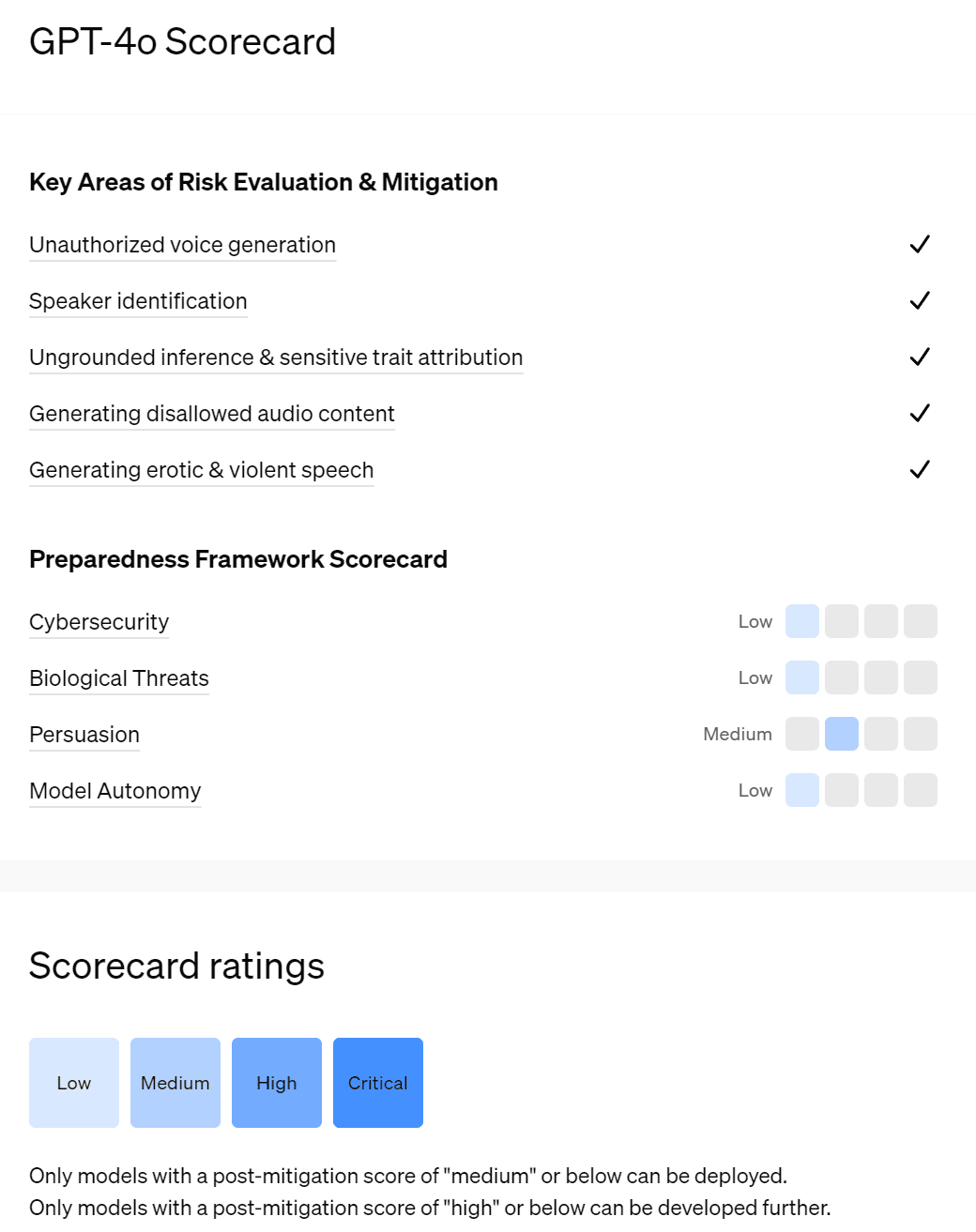 That sounds like an admission that they indeed failed their voluntary commitments to the White House. GPT-4o was released on May 13, 2024. The system card was released on August 8, 2024. That’s almost three months later.