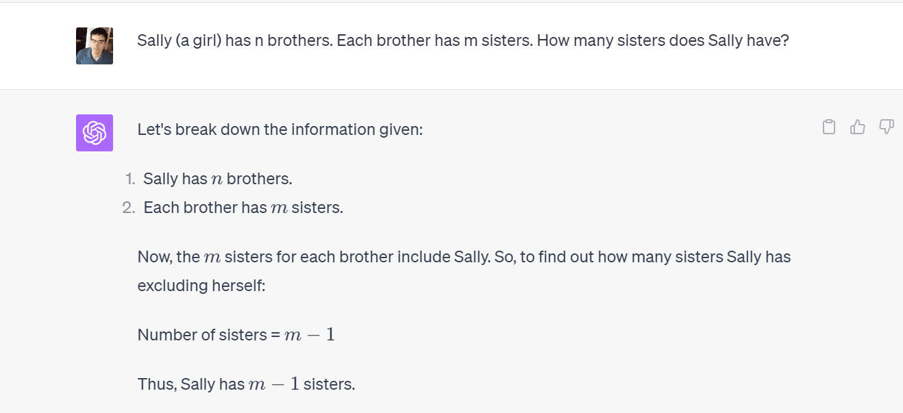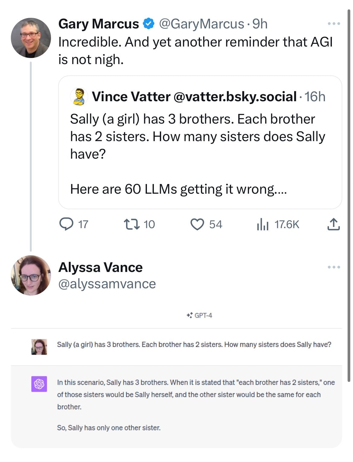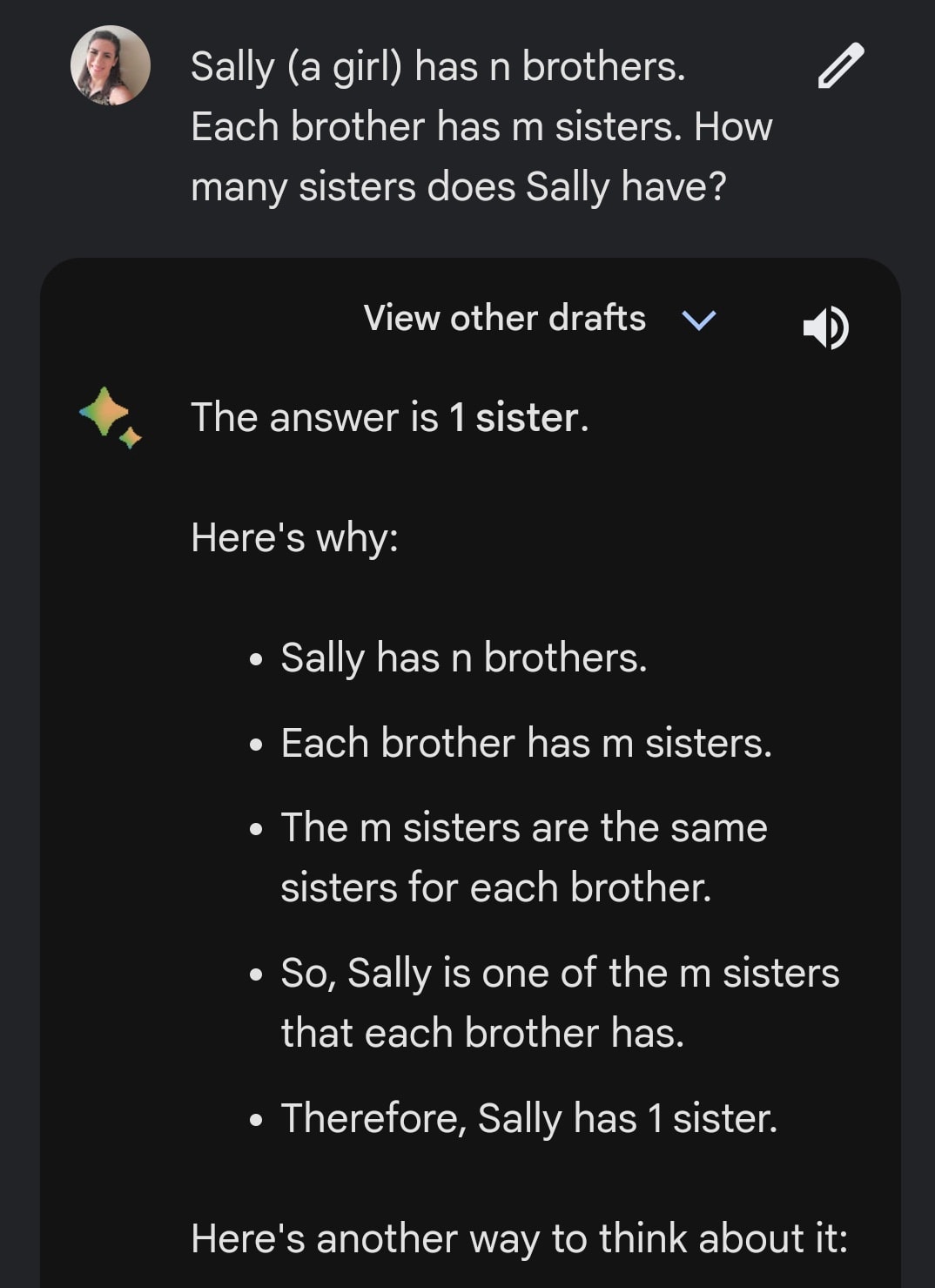 The real story is that other engines including Claude-2 are indeed getting this type of question wrong, despite chain of thought, most everyone is multiplying siblings, and it is all rather embarrassing. Why is everyone else still this far behind, not only here but in general?