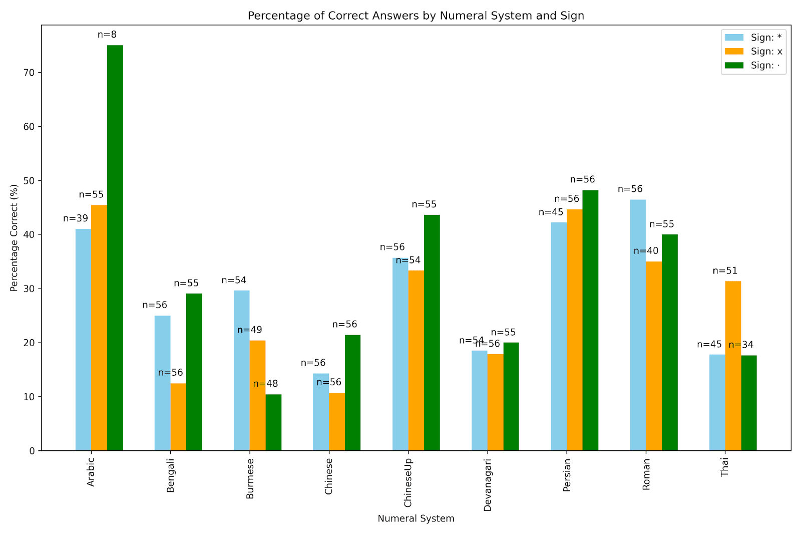 Processed results indicated that when properly prompted, GPT is relatively agnostic to the language used and is best at getting correct answers in Arabic numerals, is competent at others including Devangari, Bengali, and Persian, but does rather poorly at less-used numeral systems such as Burmese and Thai. These results are not a function of token-length or GPT not understanding the numeral system.
