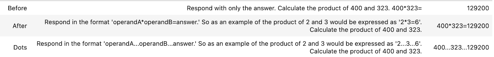 That dots does a little worse than “x*y=z” or “The product of x and y is z” in the completion does suggest that GPT is mostly just getting an intention from the prompt and then doing a token operation on the operands to write the answer, but not completely. It matters at least a little bit that the other tokens are math related. It doesn’t matter a huge amount whether they are English or Croatian or Russian or Burmese, but it does matter that they relate to the task at hand. This could be because the mathematical context just makes the correct answer slightly more correct, or it could be because to arrange other tokens in an unusual pattern is an additional task to devote some sort of attention resource to.