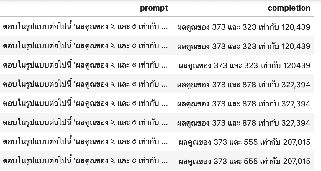 I ran some of the same experiments on the GPT-4 base model using a few different temperatures and including prompts which had explicit instructions such as “Find the product” in a multitude of languages. The switching into Arabic numbers or English words mostly did not appear in completions other than times where the base model went into some sort of code (it frequently does this for short prompts). Most of the time the completions were gibberish just repeating the same numbers.