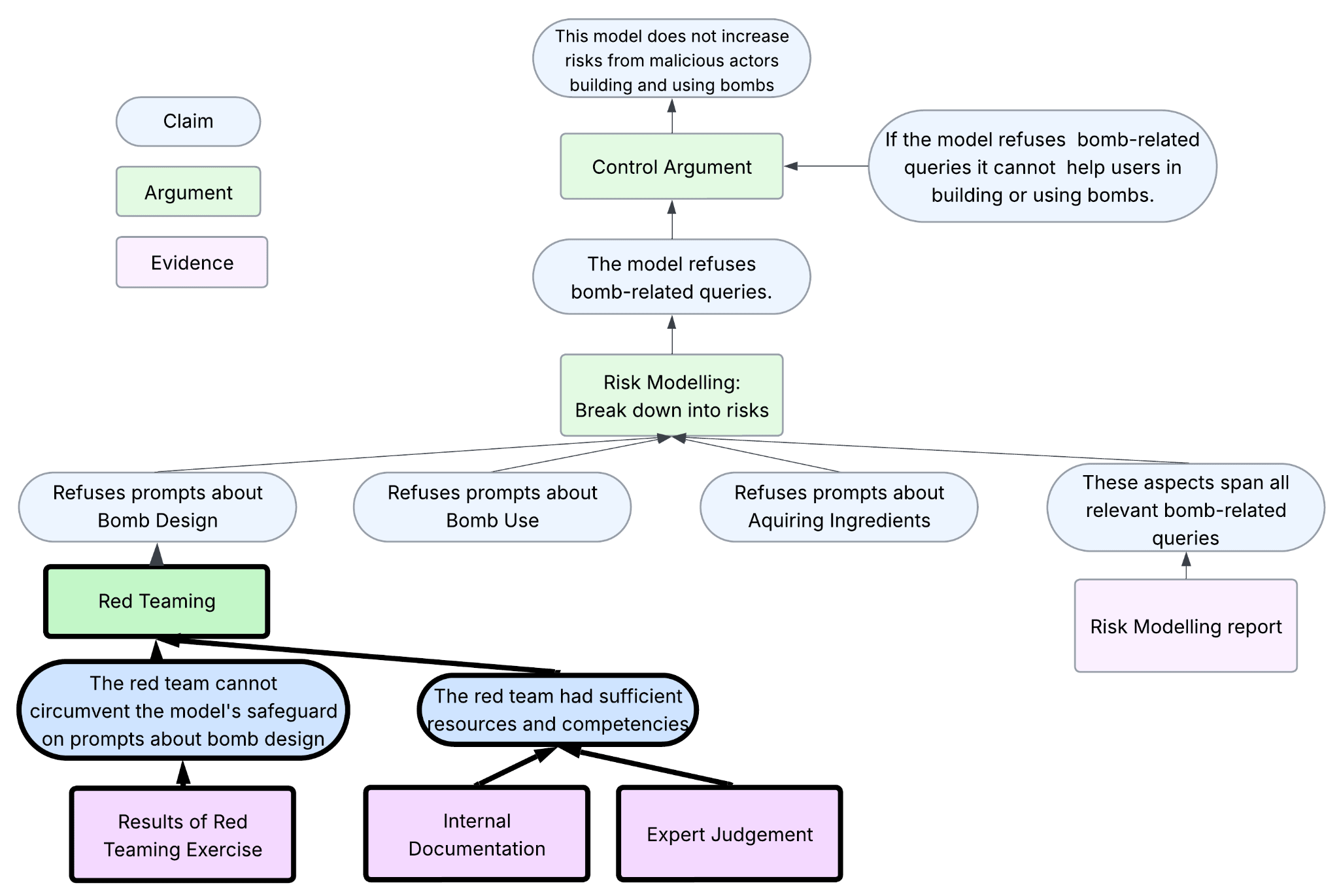 What evidence could we use to prove that our model will refuse relevant queries? For our safety case, we will use a red teaming exercise as evidence. If red teamers cannot get the model to give support with bomb building, this indicates that malicious actors can also not do this. To strengthen this argument, we are making another claim that the red teaming adequately assesses the risk.