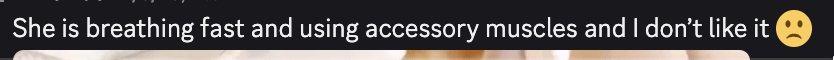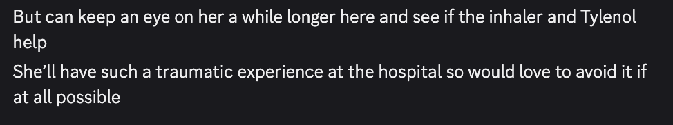 My child has reactive airways that get closed up when she gets a cold[4]. We took her to the hospital at 11-months and 17-months due to cold-induced labored breathing. That first visit was very upsetting to the little baby. I'd never seen her scream and cry like that. Just extreme distress.