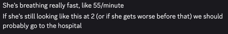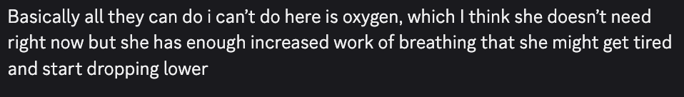 It's important for this piece that my spouse was wrong that the only thing hospital could/would do that we couldn't was provide supplemental oxygen. It's possible that if we'd had oxygen at home, that would have been sufficient to turn things around. It's also possible that it wouldn't have. I then expect my spouse would have noticed via her monitoring, and we'd have ended up in the hospital anyway but a few hours later.