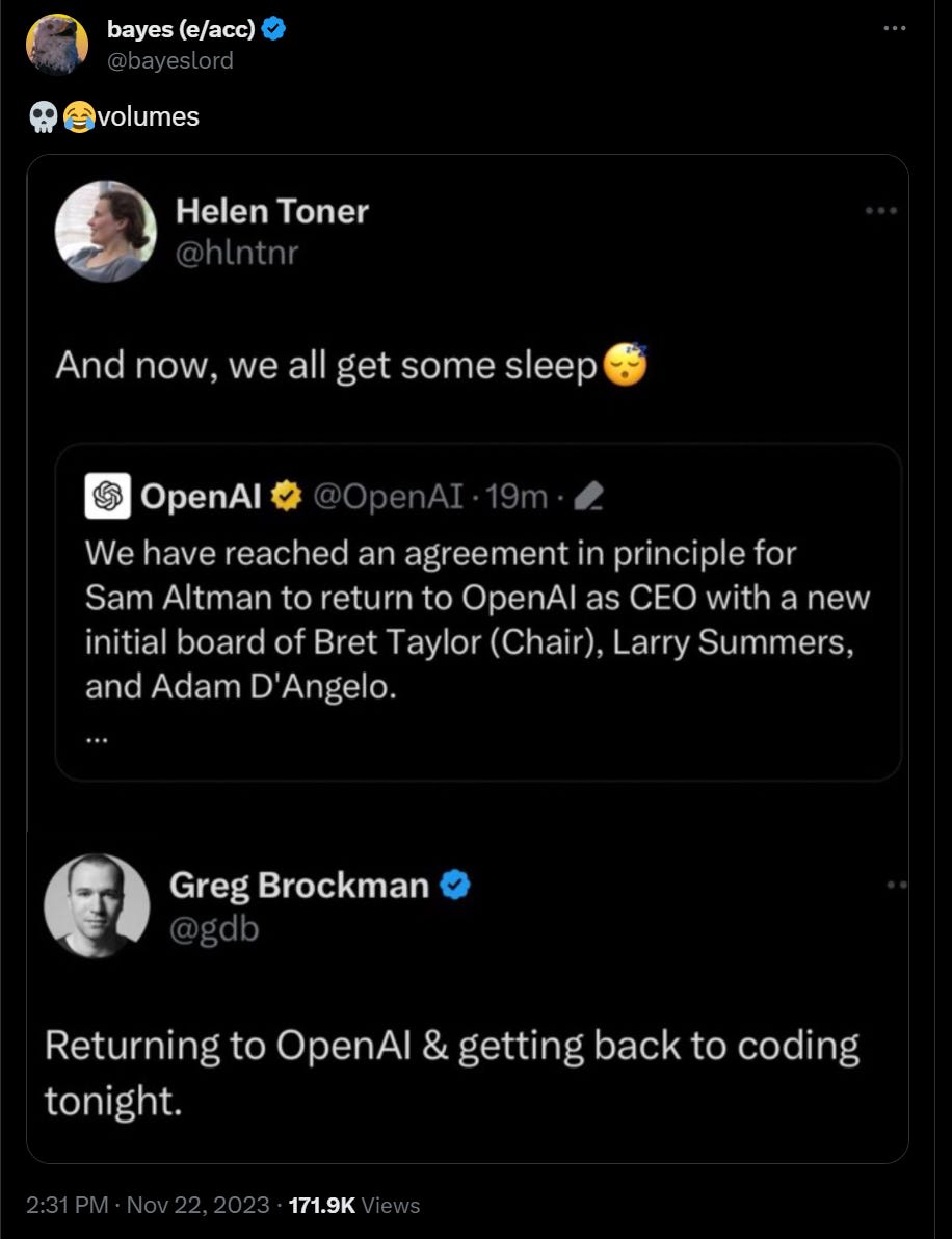 Altman now has the loyalty of his team, a clear ability to shut down what he helped build if crossed, and unwavering faith of investors who trust him to find a way. No one can say they do not ship. OpenAI retains a rather large lead in the AI race. The e/acc crowd has rallied its flags, and was always more into being against those against things rather than anything else.