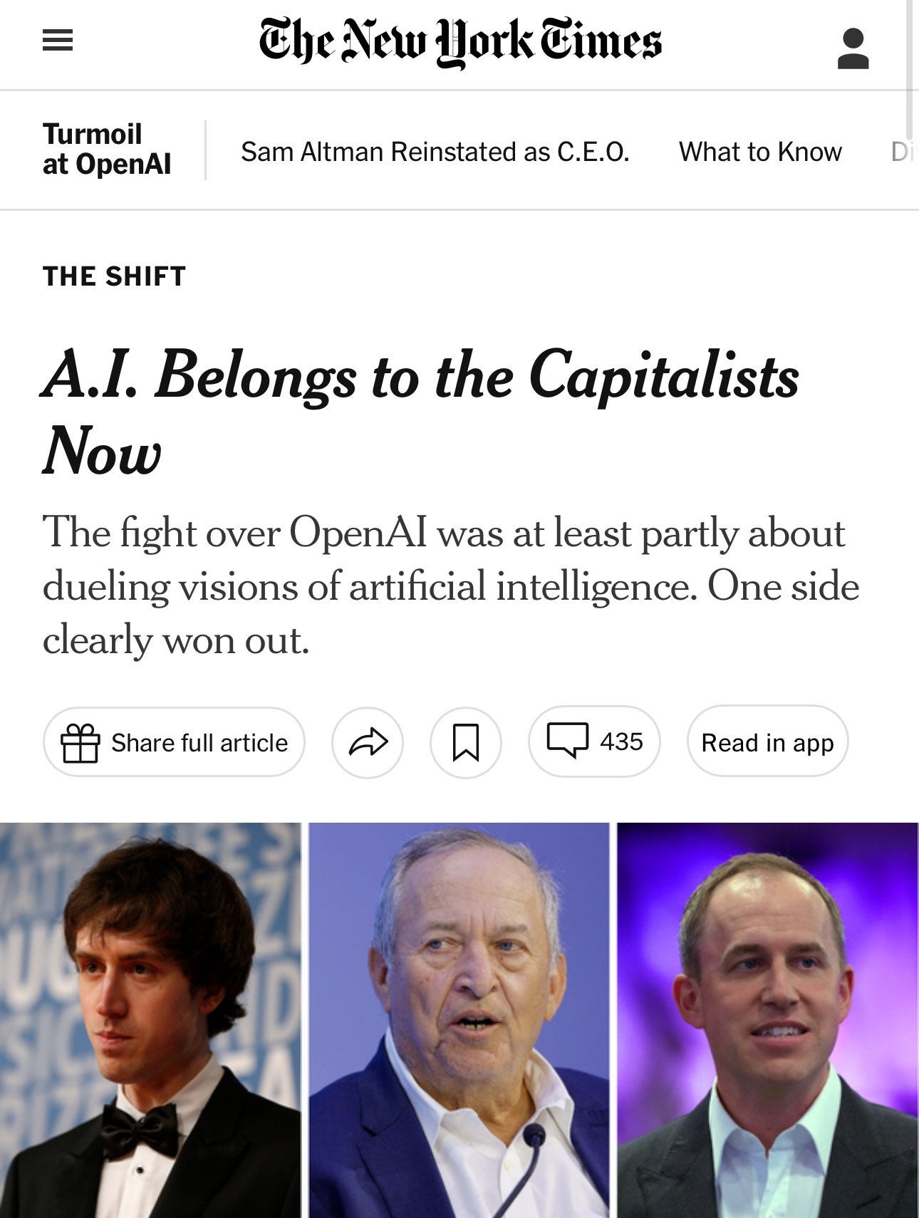 Nor was Altman’s reinstatement inevitable. Imagine a world in which the board, instead of remaining silent, made its case, and also brought in credible additional board members while firing Altman (let’s say Taylor, Summers, Shear and Mira Murati), and also did this after the stock sale to employees had finished. I bet that goes considerably differently.