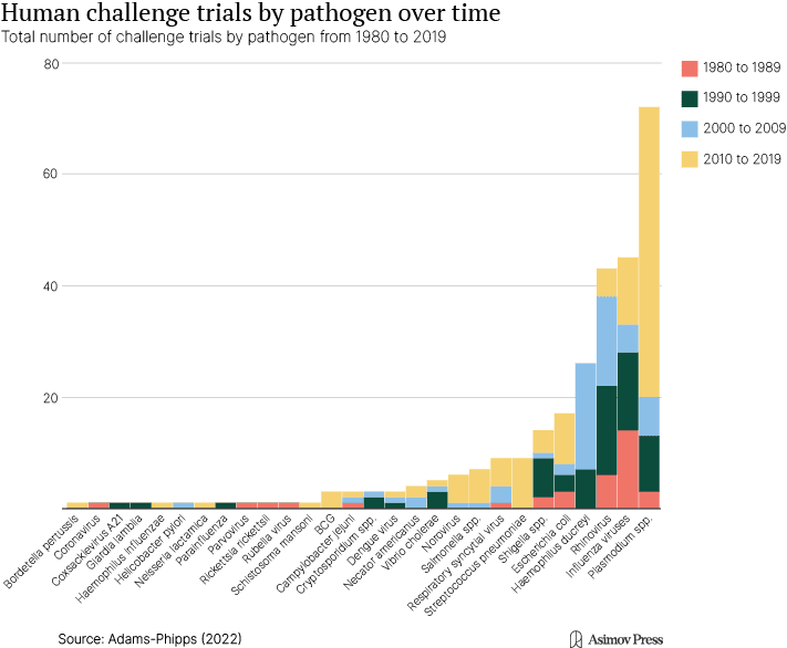 I would also credit the uptick to the development of really solid challenge models that helped demonstrate human challenges can indeed be done safely. A lot of work was done to figure this out for malaria in the 1970s and 1980s in the U.S. and Europe. When those studies showed that challenge trials could be ethical, safe, effective, and useful, they became more enticing and doable for other diseases.2