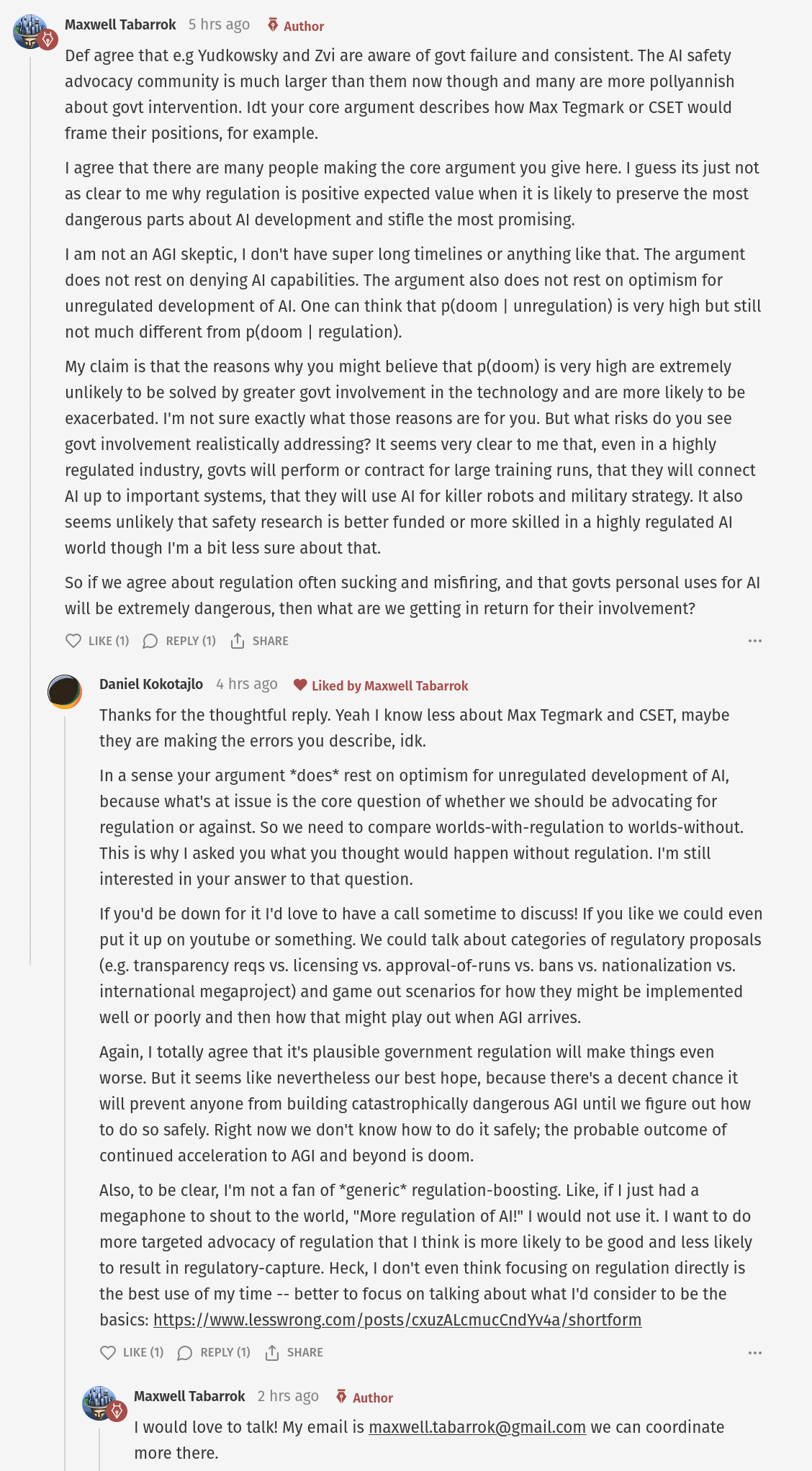 I also think we might be talking past each other re regulation. As I said elsewhere in this discussion (on the OP's blog) I am not in favor of generically increasing the amount of AI regulation in the world. I would instead advocate for something more targeted -- regulation that I actually think would really work, if implemented well. And I'm very concerned about the "if implemented well" part and have a lot to say about that too.