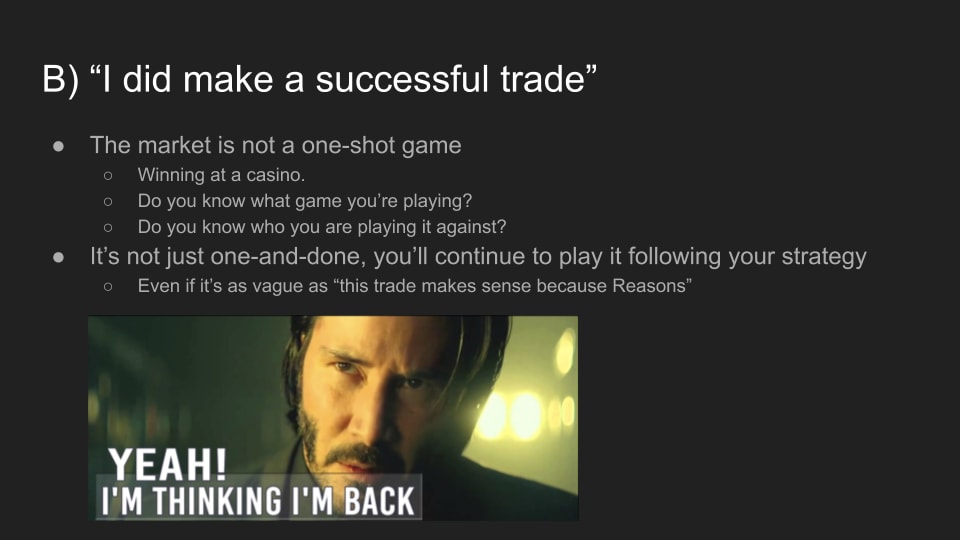 Point B: "Oh, I made a successful trade. Or maybe two, maybe three." Well, the market is not a one shot game. It's like if you go to a casino and you bet everything on red and double your money. You can't really say, "Well, I beat the casino."