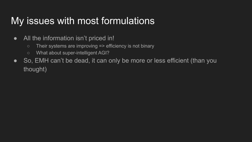 The main one is that they claim that “information is priced in”. I think it's obvious that it's not priced in, because who is pricing it in? It's entities, agents, hedge funds and traders that are doing the work of pricing it in. And every day, they're improving their systems, which means that yesterday they weren't pricing in something that they're pricing in today.
