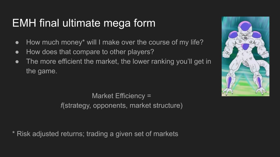 So my proposal for the final ultimate mega form of EMH is to really ask the question: how much money will I make over the course of my life? How does that compare to the other players participating in the markets?