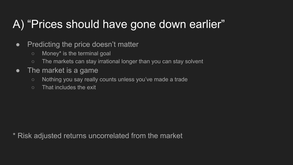 Point A: Actually predicting the prices doesn't really matter. We're trying to make money. That's the terminal goal, predicting the price is just instrumental. You have to remember that the markets can stay irrational longer than you can stay solvent. You can correctly predict that the markets will go down eventually, but in the meantime you've entered your position, and they keep going up. You might get liquidated or you might just think that you were wrong and exit your position prematurely.