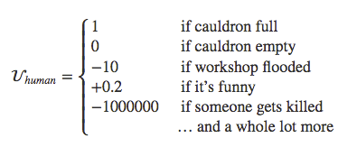 The second difficulty is that Mickey programmed the broom to make the expectation of its score as large as it could. “Just fill one cauldron with water” looks like a modest, limited-scope goal, but when we translate this goal into a probabilistic context, we find that optimizing it means driving up the probability of success to absurd heights.