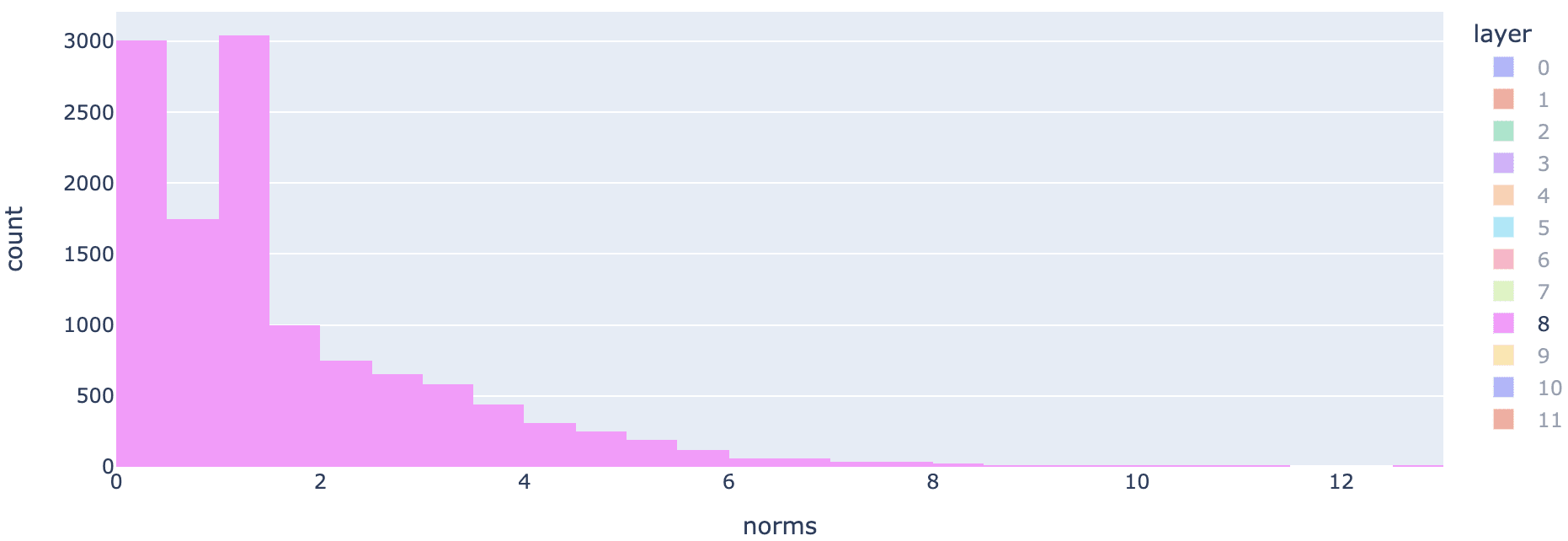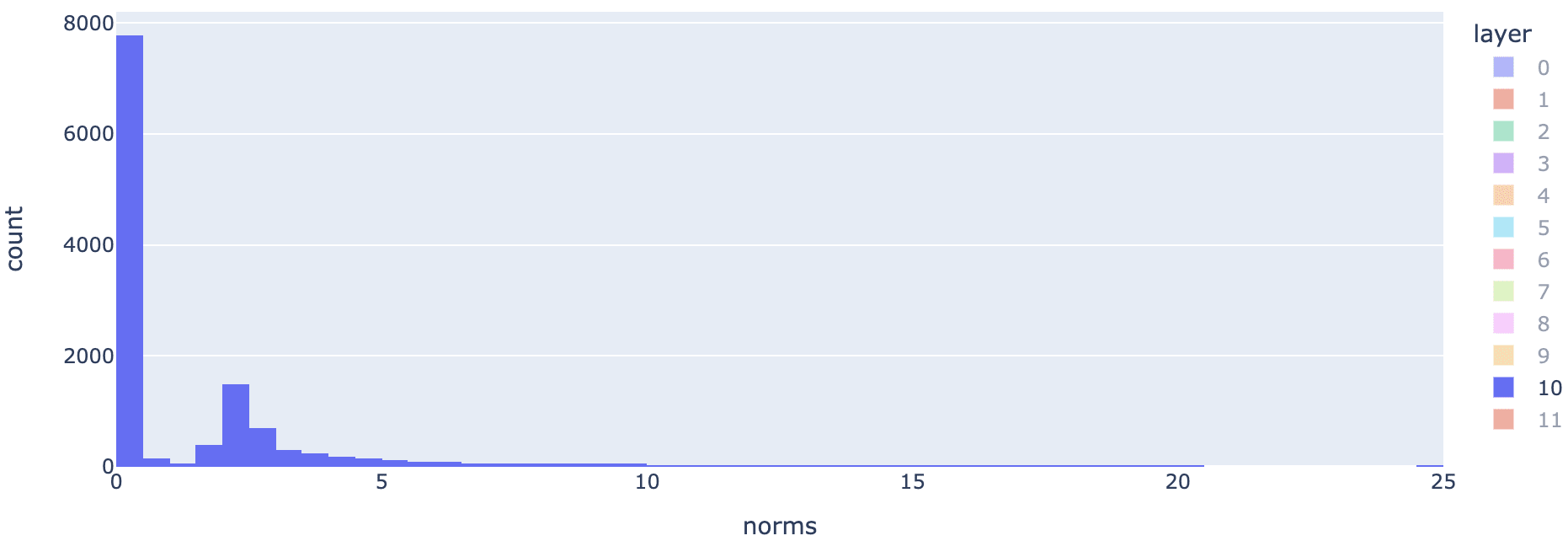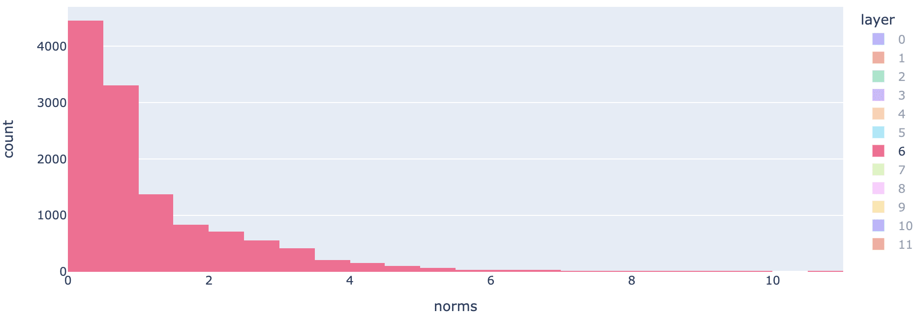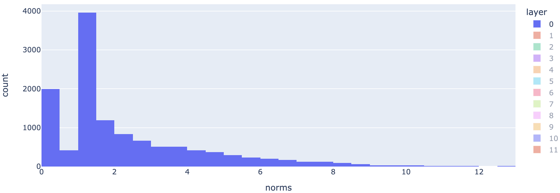 Figure 12. Norm distribution histogram of the feature vectors from the NSAE decoder across layers. |