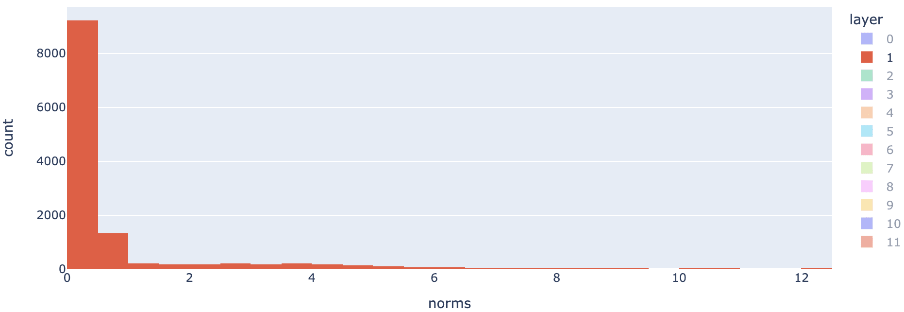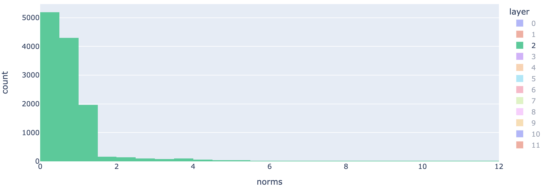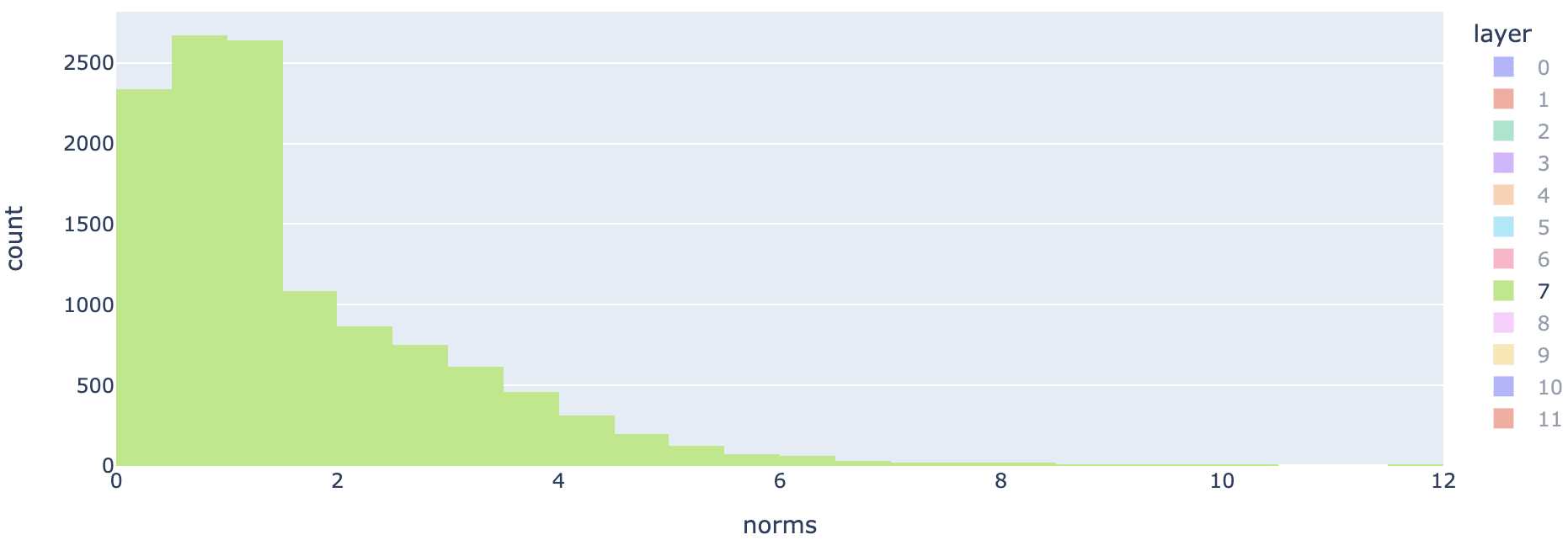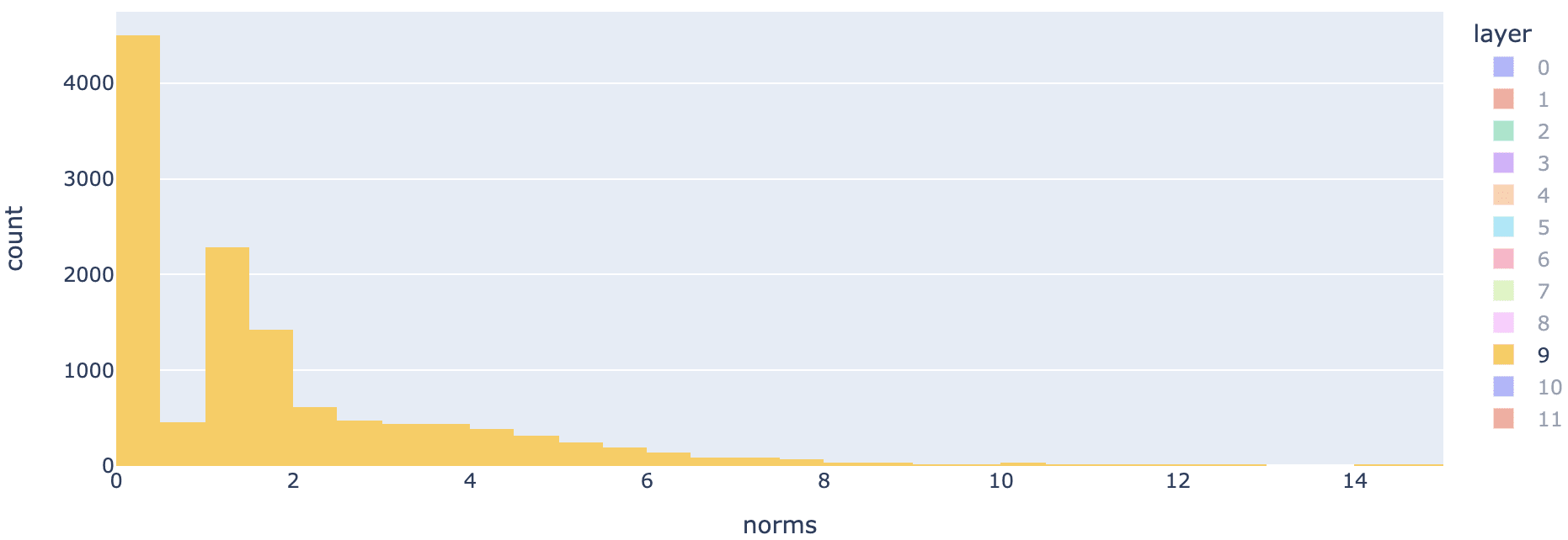 Figure 12. Norm distribution histogram of the feature vectors from the NSAE decoder across layers. |