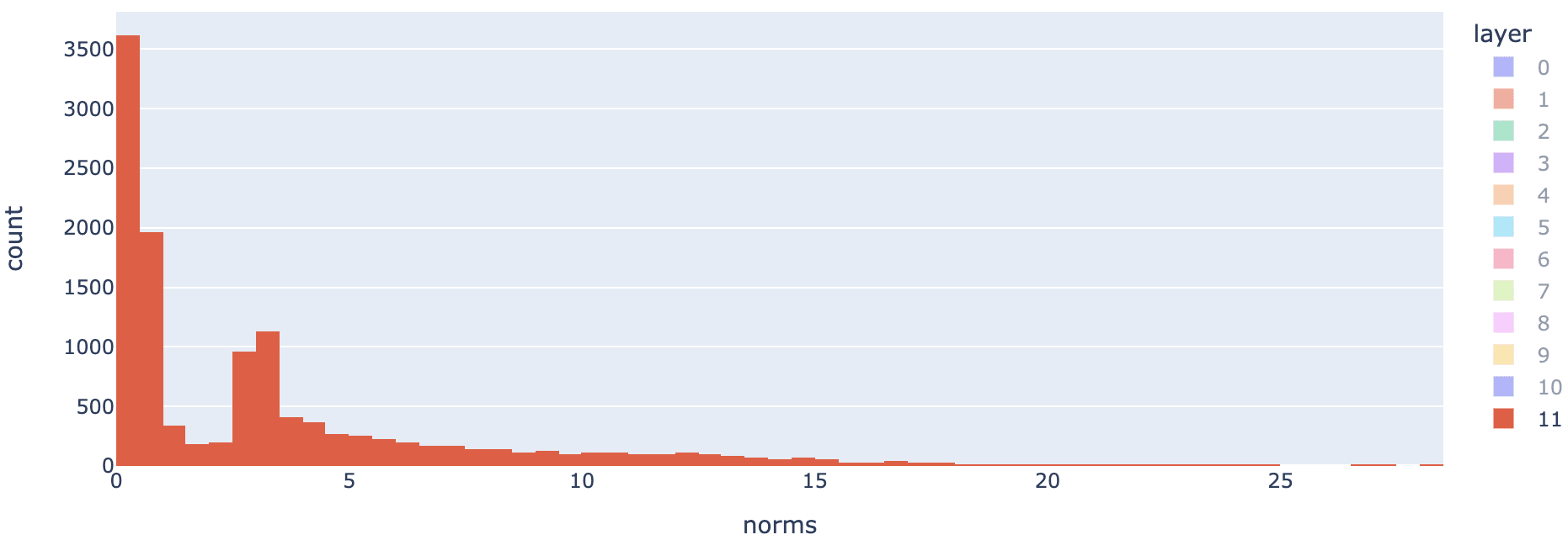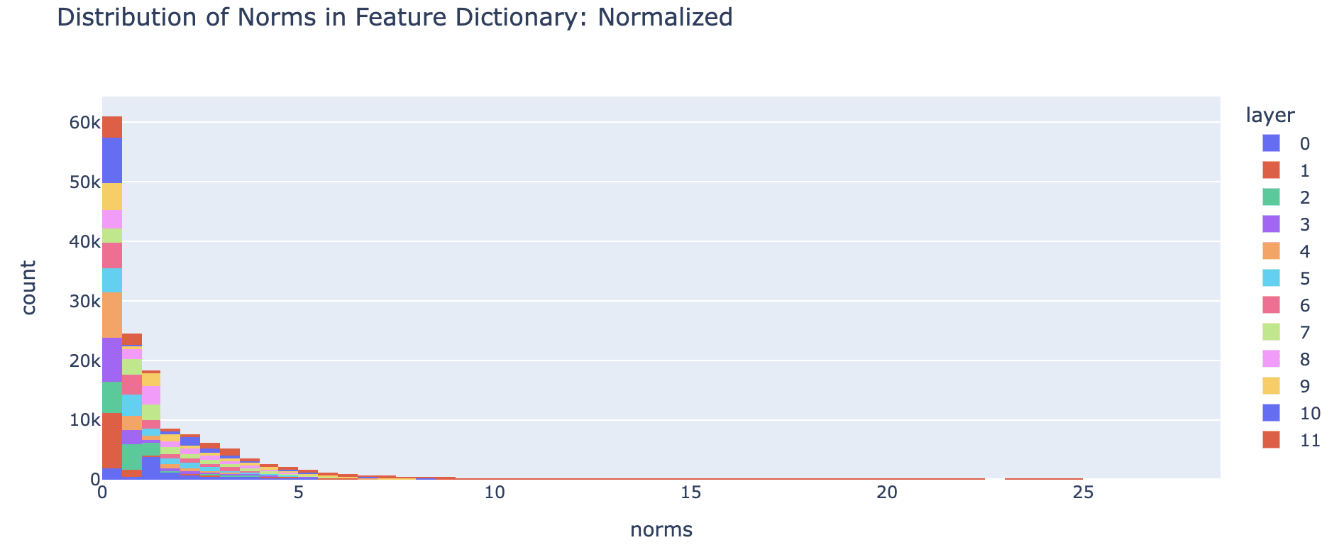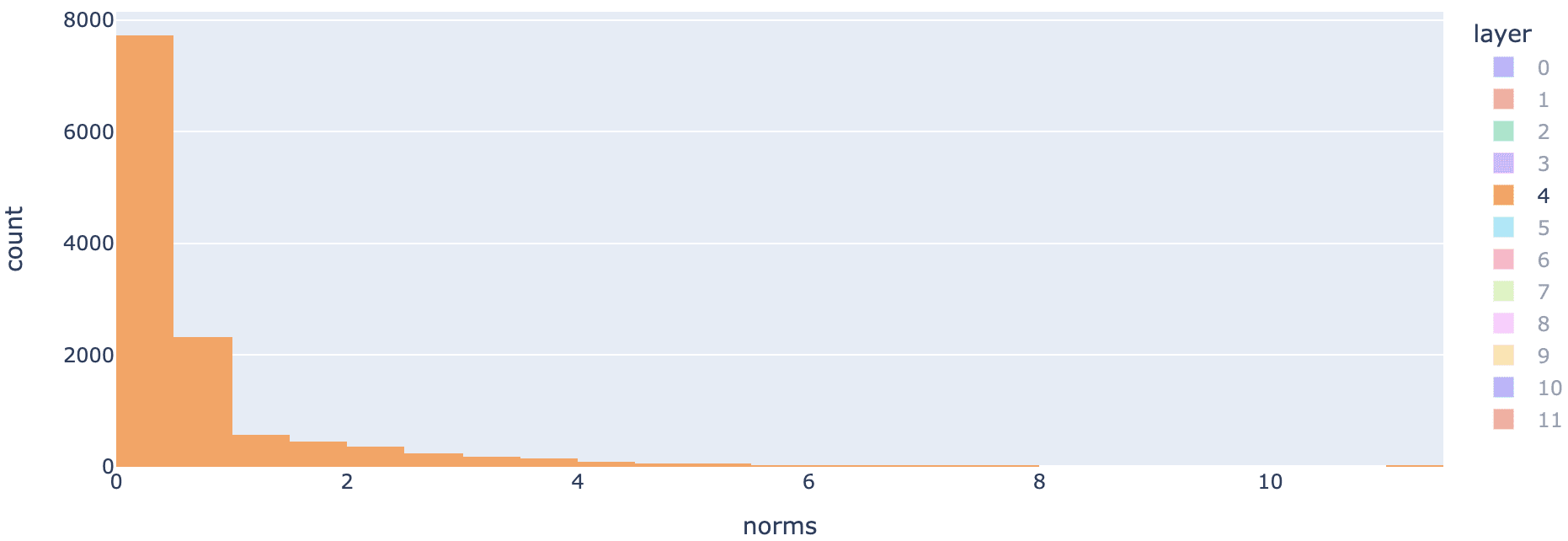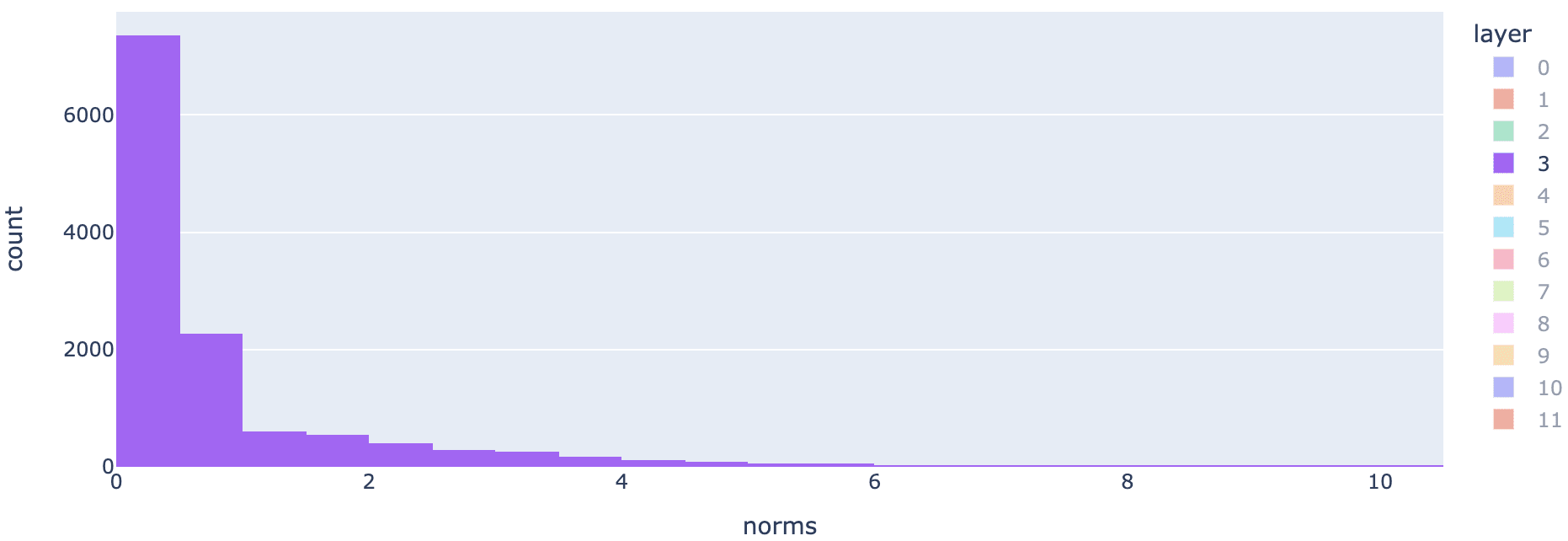Figure 12. Norm distribution histogram of the feature vectors from the NSAE decoder across layers. |