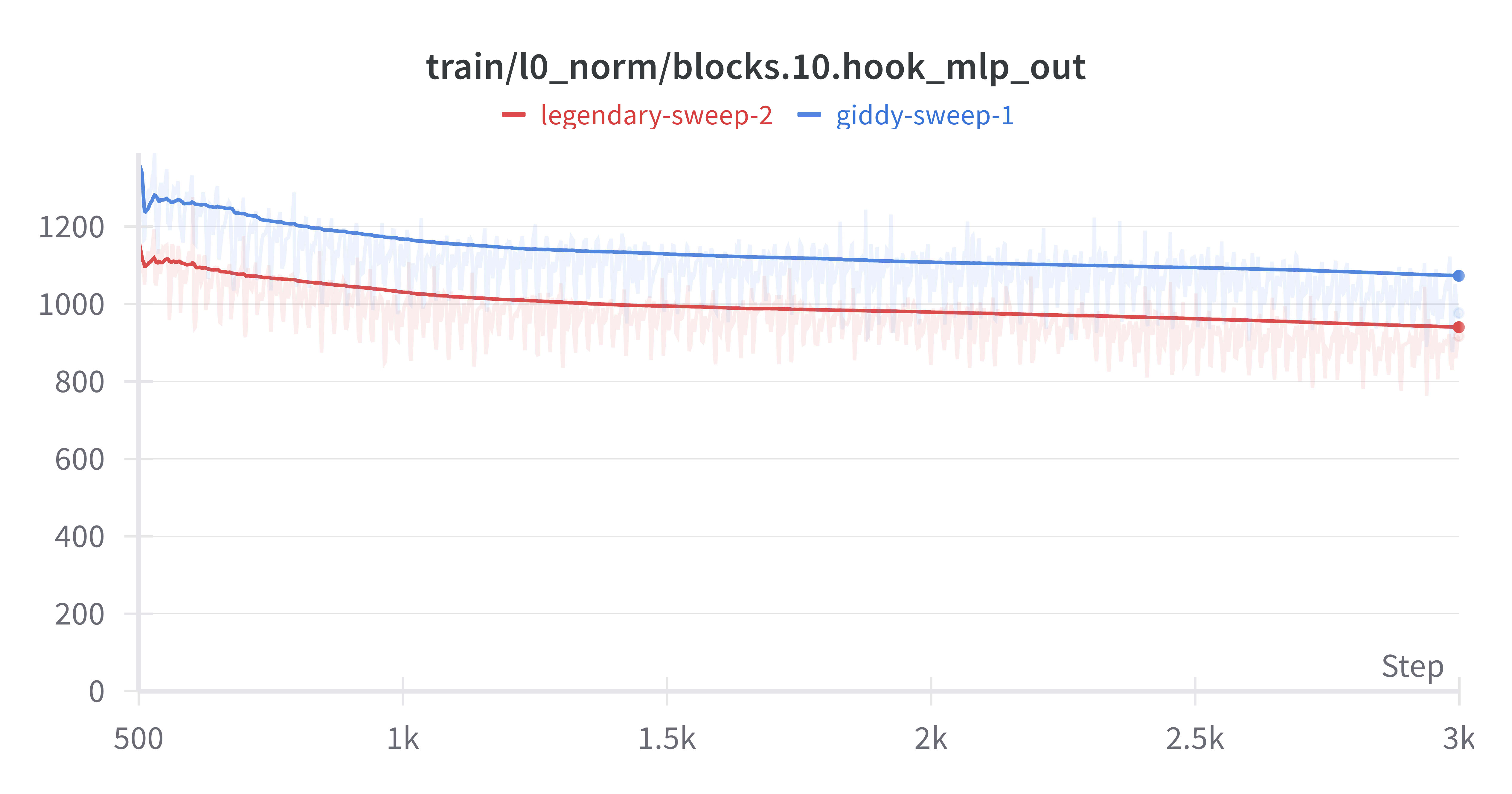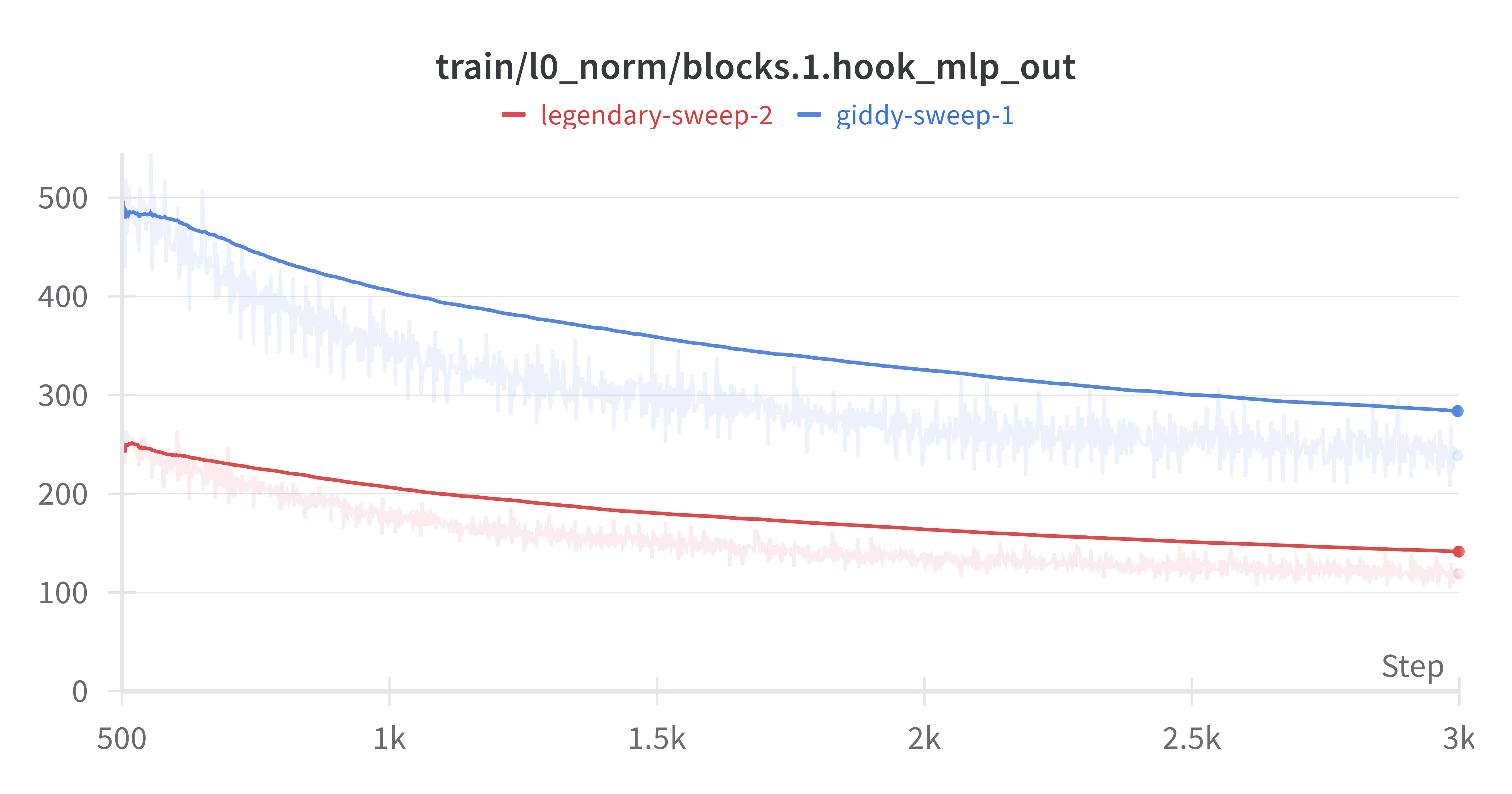 Good point. Firstly, the mean L0 between the experiment and the baseline is within a scaling factor of 2, so it's in a reasonably close range. I also added a new set of figures comparing the reconstruction score of one layer that have the closest match on L0 between the experiment group. Spoiler, the scores are still almost the same at the end of training. You can find it under Experiments-Performance Validation.