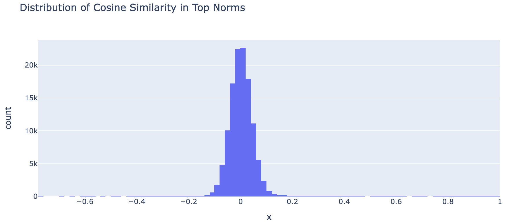 A natural question to ask is that: do pillar vectors and direction vectors overlap? To answer this, I picked the top- vectors (in terms of norm) of each layer from the feature dictionary as a set of pillar vectors and calculated their cosine similarity, and here is the distribution:
