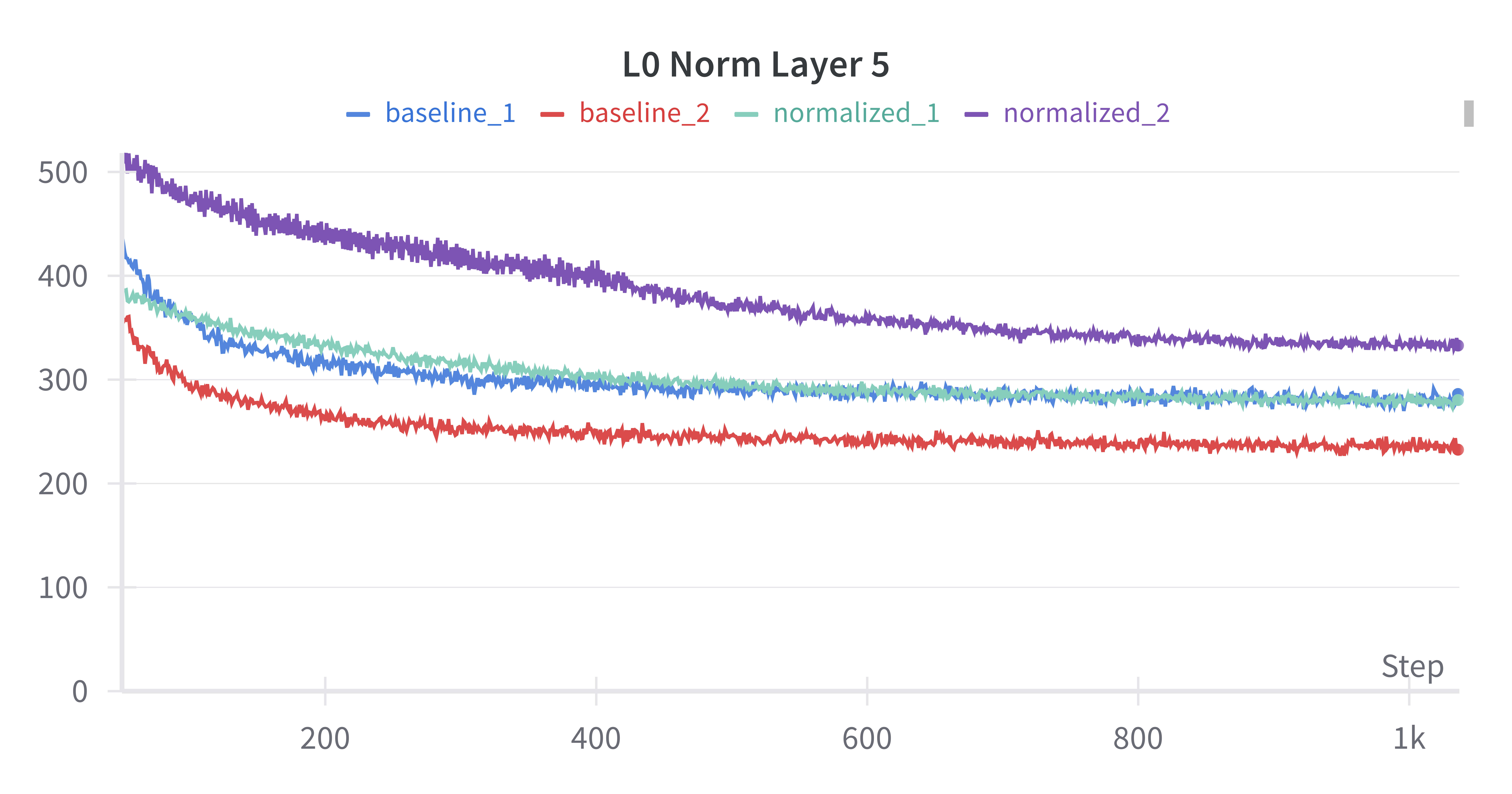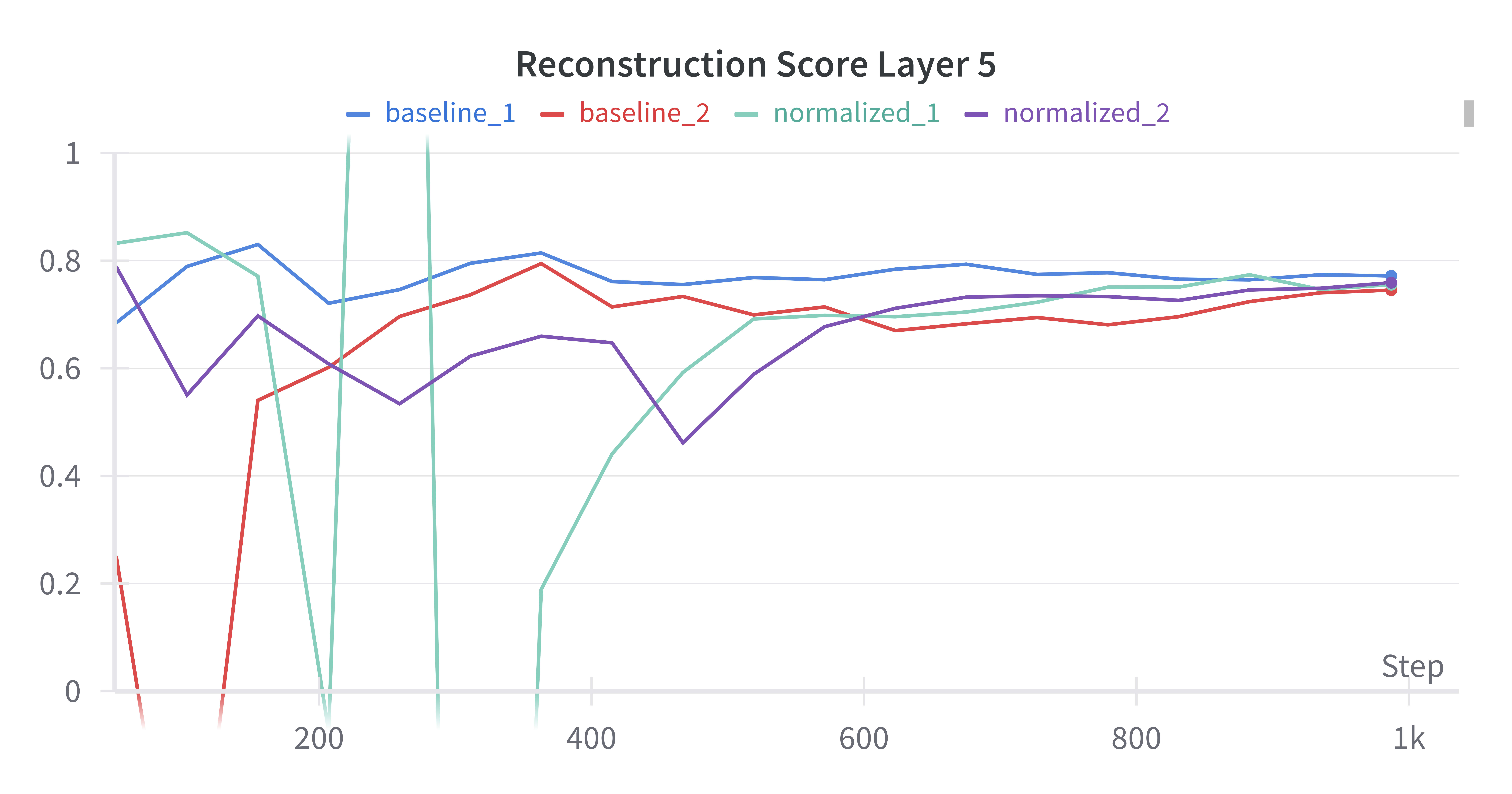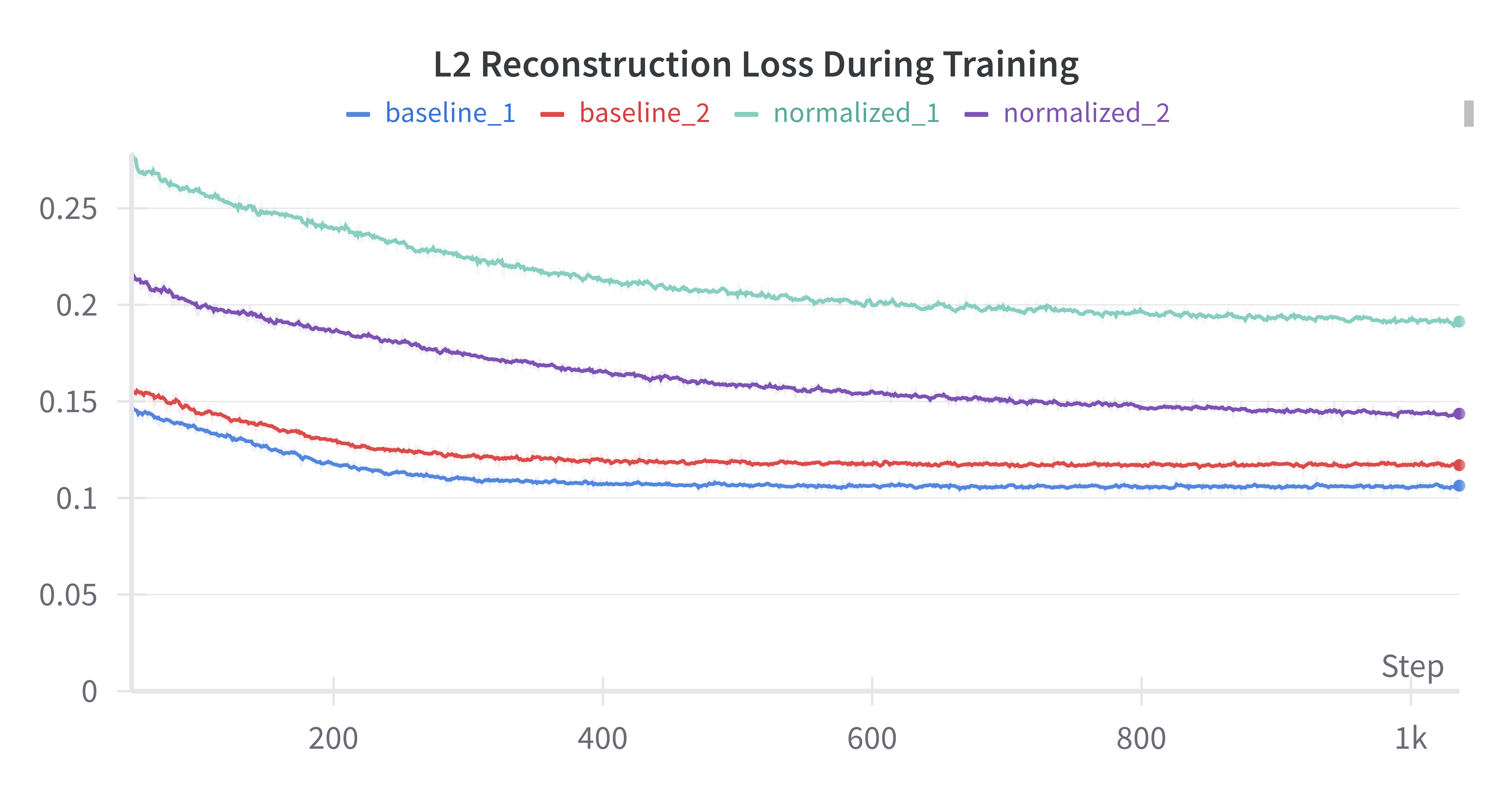 Still, there is not an observable difference between the experimental group and the baseline after convergence. This provided further evidence that the normalization did not have a observable negative impact on the performance of SAEs.