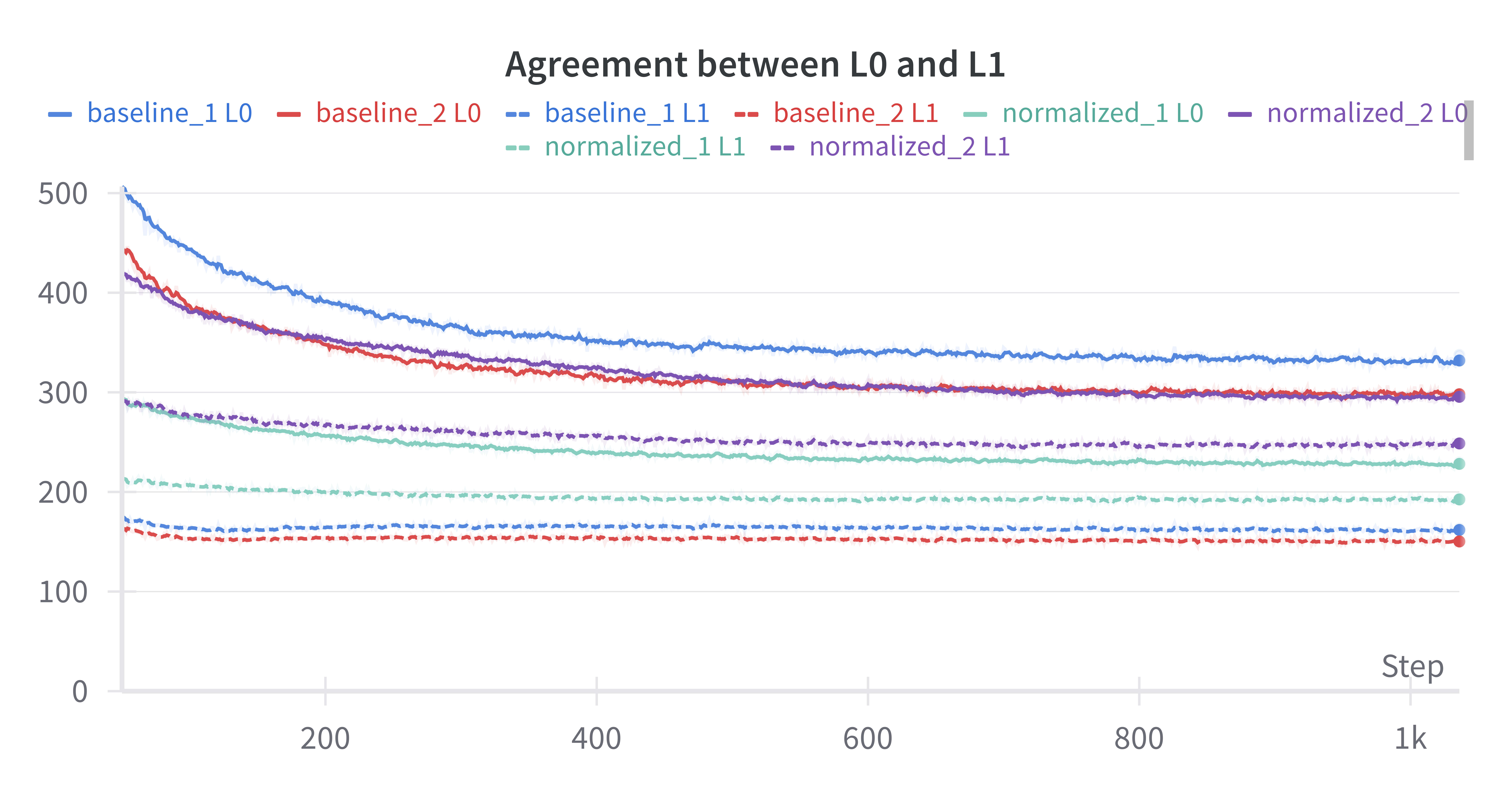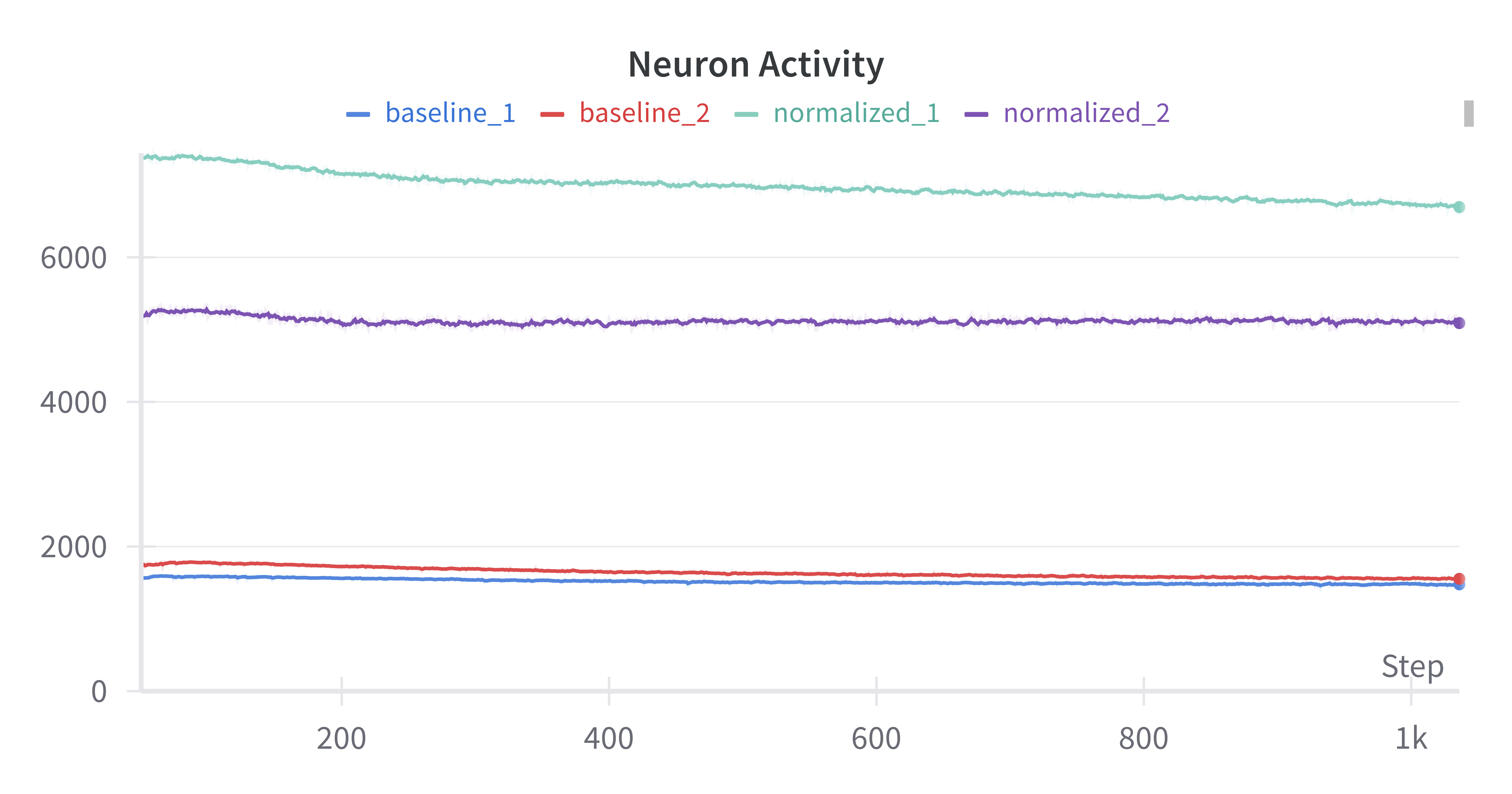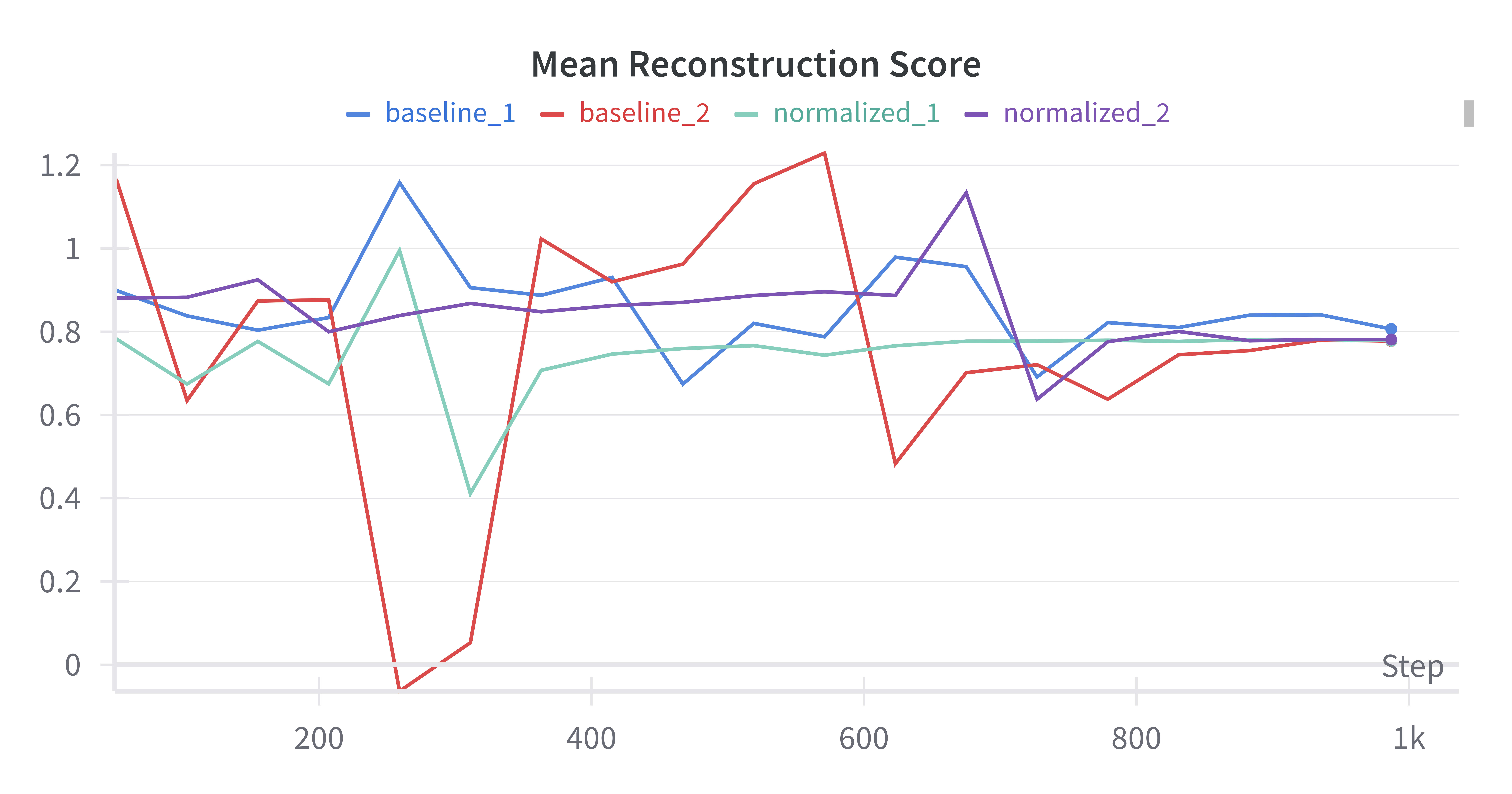 Still, there is not an observable difference between the experimental group and the baseline after convergence. This provided further evidence that the normalization did not have a observable negative impact on the performance of SAEs.