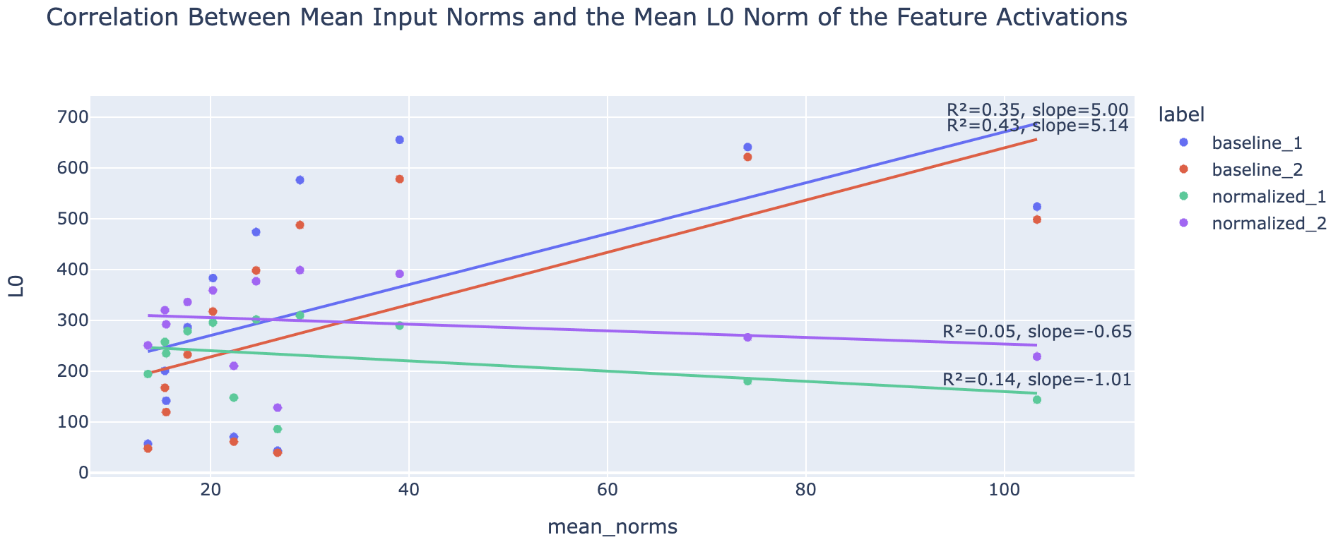 The red and blue datapoints are from the baseline group whereas the cyan and purple datapoints are from the experiment. We can fit lines to these datapoints to find linear relationships between the mean input norm and the mean norm of the feature activations. Although the fitting is not good, the fitted lines still show a rough positive linear correlation between the mean input norm and the feature activation norm in the baseline. In contrast, the two normalized samples did not exhibit a statistical significant positive linear relationship between input norm and .