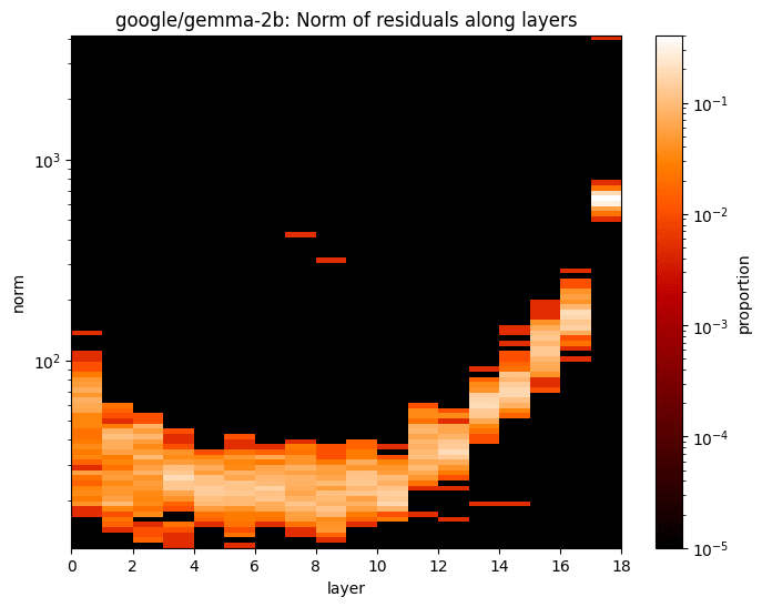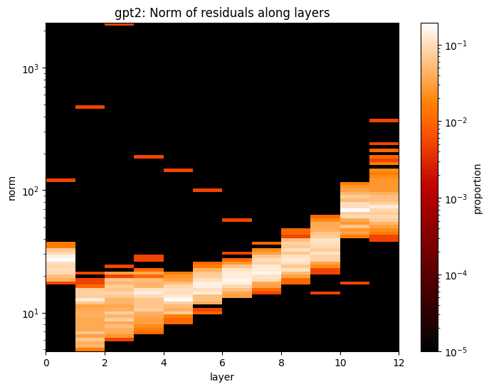 Moreover, there is an inconsistency of the norms of the source model's residual states across layers. We can plot the distribution of residual states[1] norms in GPT-2 small across layers: