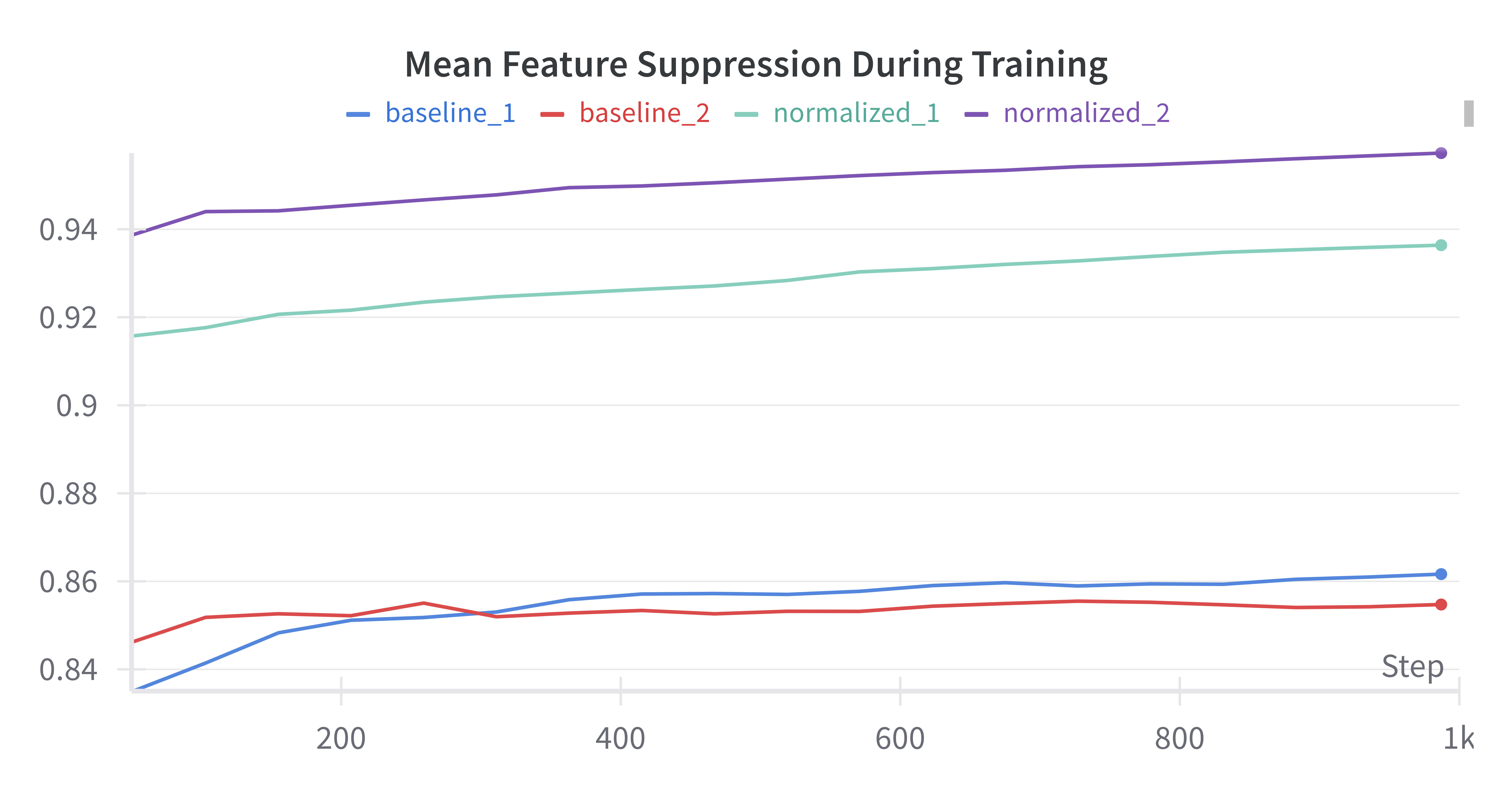 Clearly, the normalized group has significant higher score on feature suppression than the experimental group, and that score is very close to one. Considering the fact that this NSAE didn't fully converge as it only went through 200M training examples, and there is not a sign of this score to flatten, I claim that NSAEs have less to none feature suppression.