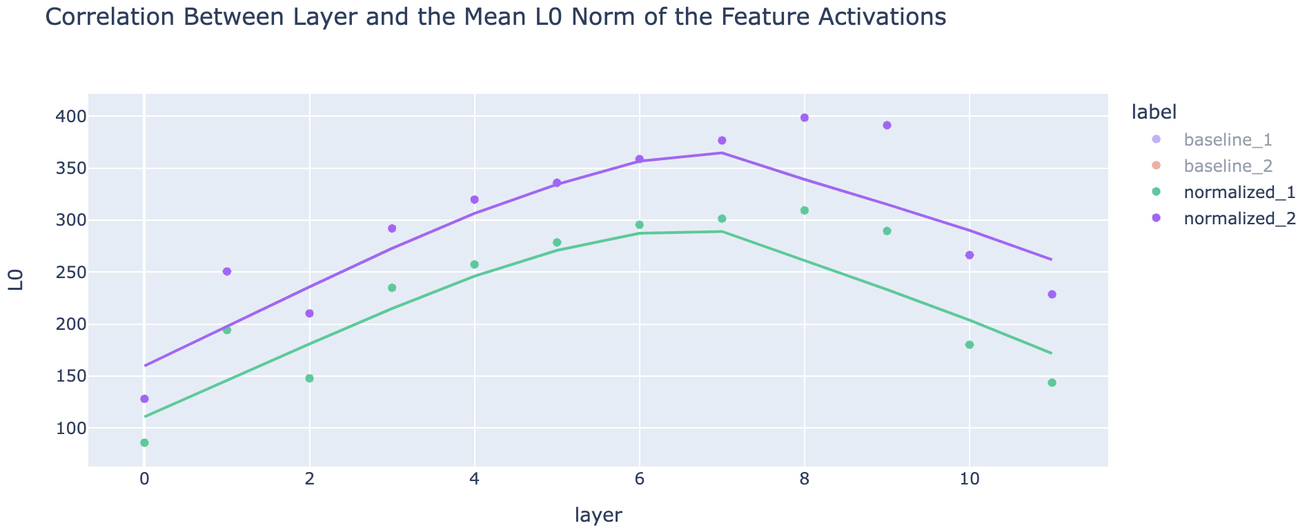 I trained two groups of SAEs, one baseline and one experiment, on all layers of GPT2, and each group contains 2 training runs trained on activations. These four runs used different sets of coefficient and learning rate, and the baseline used the original SAE while the experiment used the normalized SAE. I will use "the experiment group" and "the normalized group" interchangeably.