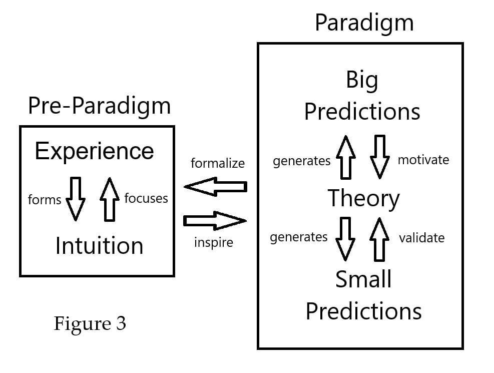 A theory must be rigorously defined to be testable, but achieving this level of rigor is nontrivial. Concepts often originate in a mental feedback loop where experience shapes intuition and intuition directs attention to relevant aspects of experience. Through repeated refinement, pre-paradigmatic ideas gradually gain enough clarity to be formalized into a testable theory. This theory is then evaluated through experiments that validate (or disprove) small predictions, while the pursuit of these experiments is motivated by the significance of the theory’s big predictions. As the theory is refined, it becomes embedded in researchers’ understanding, shaping future intuitions and informing the next cycle of discovery [Figure 3]. The intention of this sequence is to continue the iteration of simulator theory in its current pre-paradigmatic state and offer suggestions for how it might begin operating in the paradigmatic regime.
