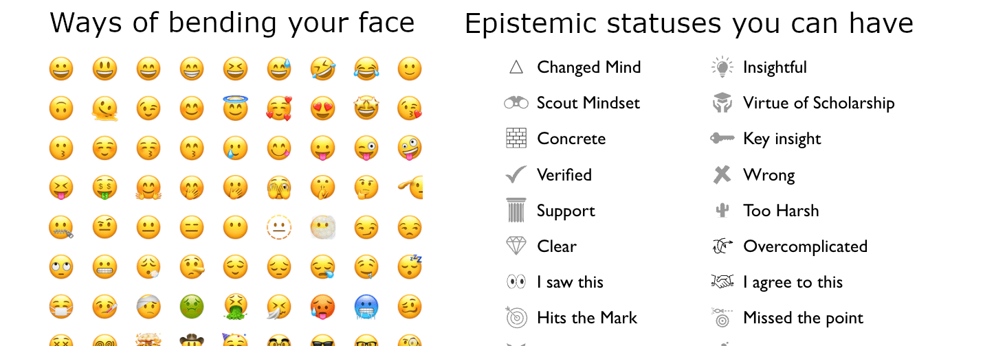 I encourage you to look out for opportunities to use theses new reacts in the coming weeks, to give them a shot at life! We shall see which of these reacts get good use, and whether the use is good for truthseeking. I expect some of them will not, and will later be replaced by even newer reacts.