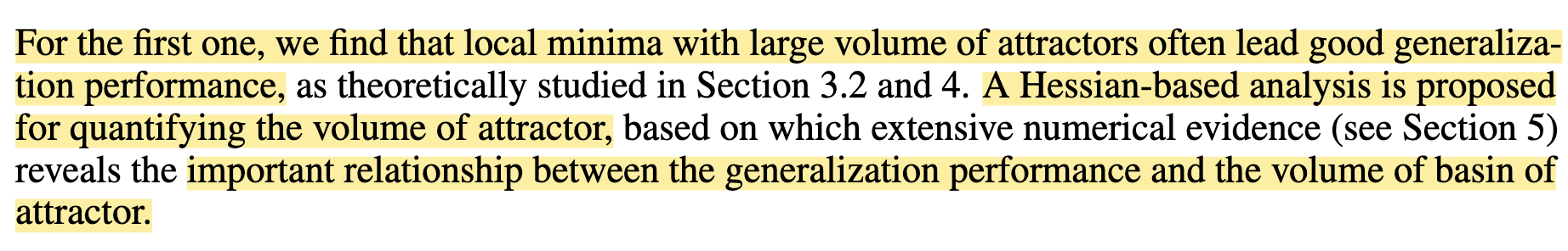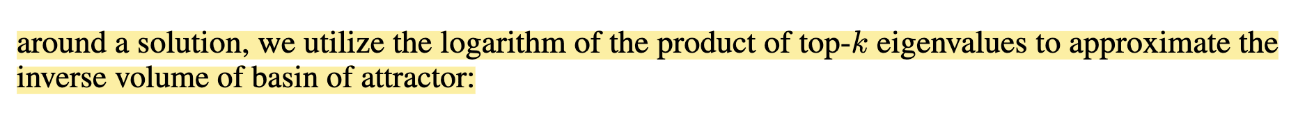 Fisher information (): This is measures how much information an observation carries about an unknown parameter. Higher fisher information means small changes in W lead to high changes in likelihood and vice-versa. Therefore our broad basins are areas where fisher information is small.
