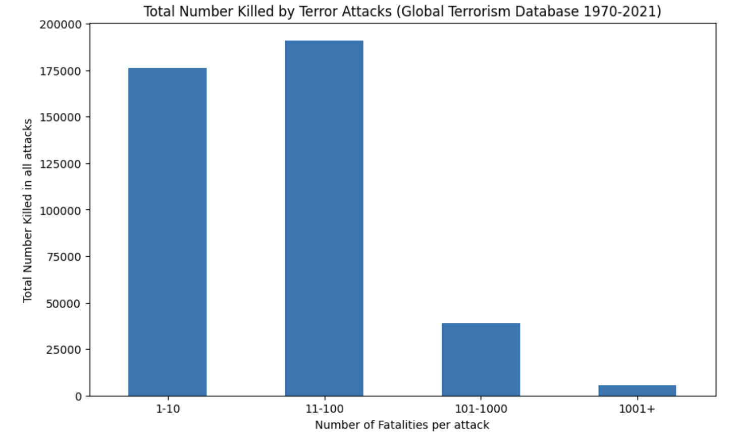 For instance, killing a thousand people in a single terror attack is much harder than killing the same number in many smaller attacks.