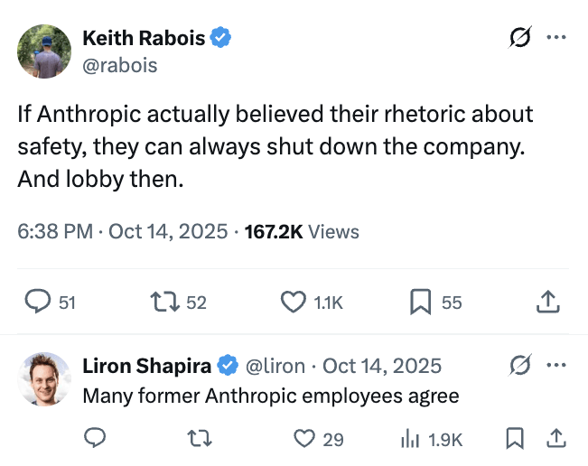 Keith Rabois recently tweeted that "If Anthropic actually believed their rhetoric about safety, they can always shut down the company. And lobby then." I'm not the only one who thinks his logic is correct.
