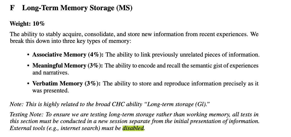 If the authors are saying that all AGIs will pass this test, it’s pretty clear to me that this is not true, mostly because of what they call “Capability Contortions.” According to the paper Capability Contortions are “where strengths in certain areas are leveraged to compensate for profound weaknesses in others. These workarounds mask underlying limitations and can create a brittle illusion of general capability.” Further that “Mistaking these contortions for genuine cognitive breadth can lead to inaccurate assessments.” For these reasons the authors disable external tools on the tests like F - Long Term Memory.